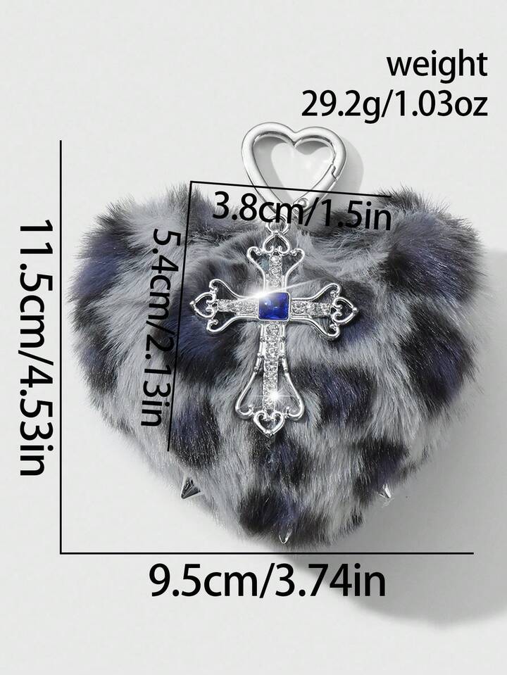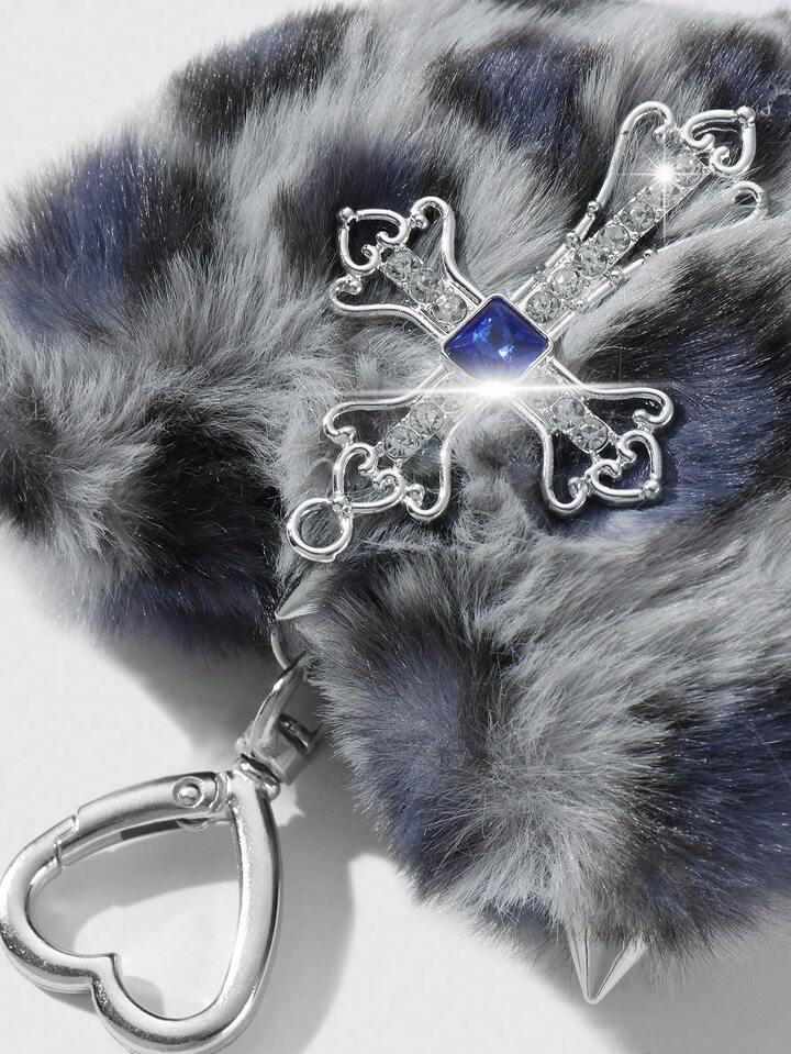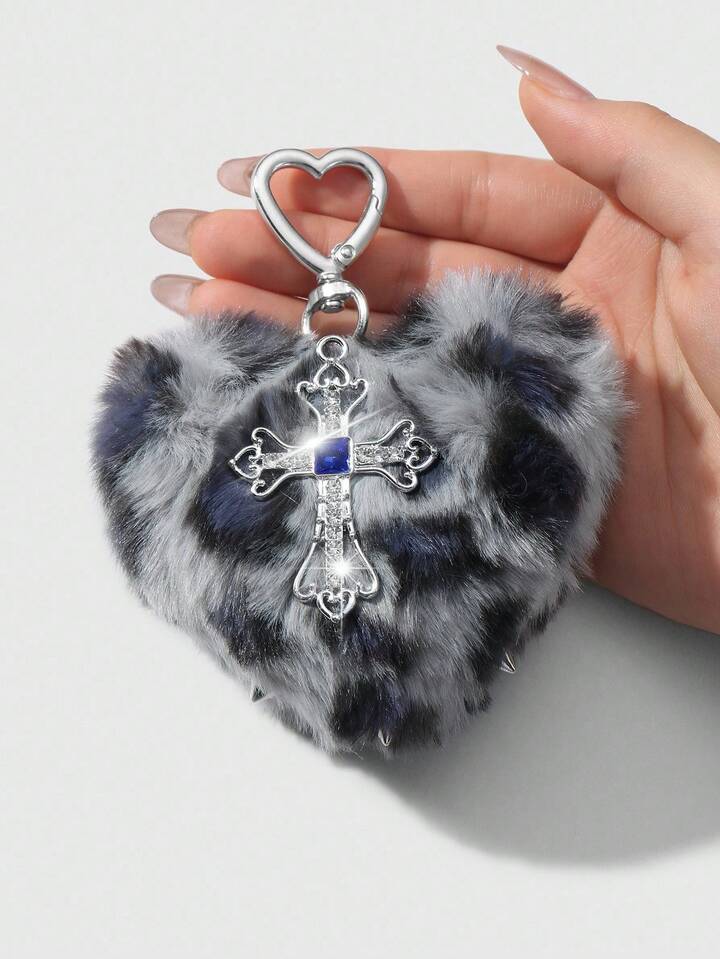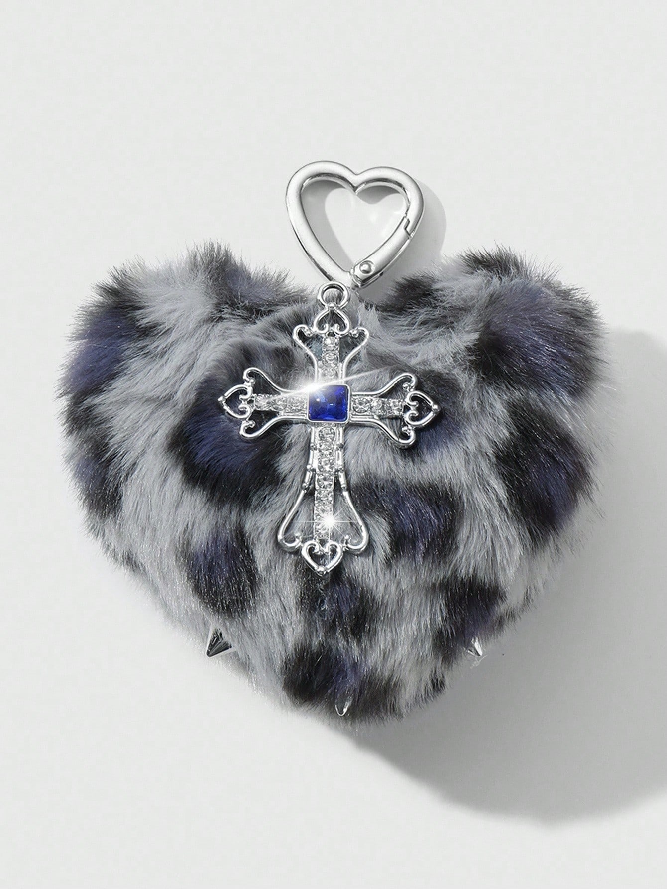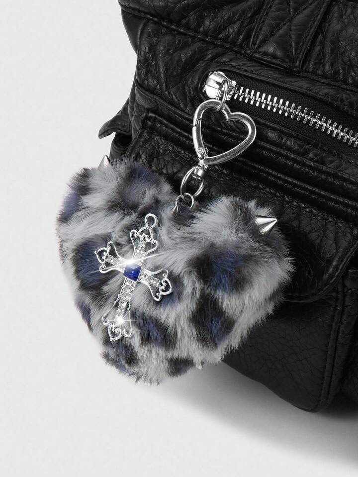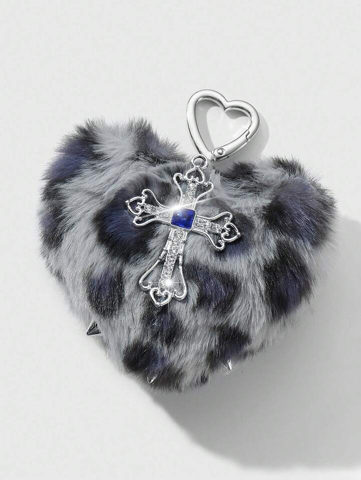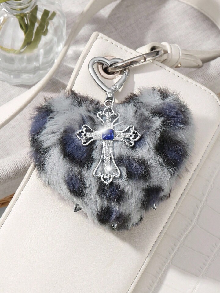 Kawaii 1pc Y2K Retro Chic Punk High-End Gray Faux Fur Animal Print Rivet 3D Heart Crystal Hollow Cross DIY Keychain Bag Charm, Suitable For Women, Daily Wear, Holiday Gift