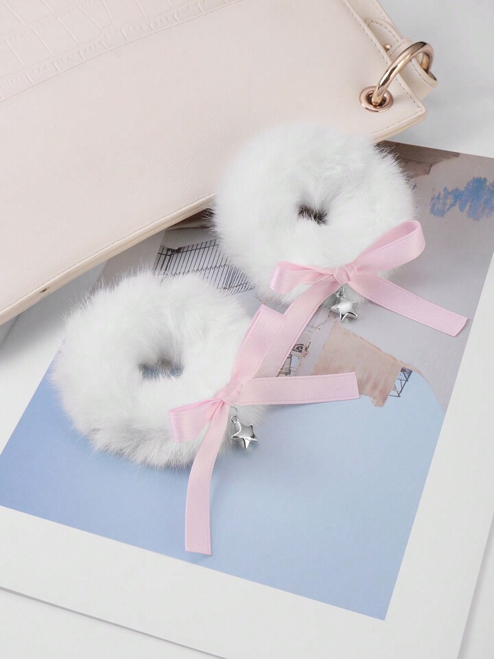 Kawaii 2 Pcs Korean Style Minimalist Cute Versatile High-Quality White Fluffy Hair Scrunchies Set With Bow & Star Charms, Suitable For Women & Girls Daily Use, Holiday Gift