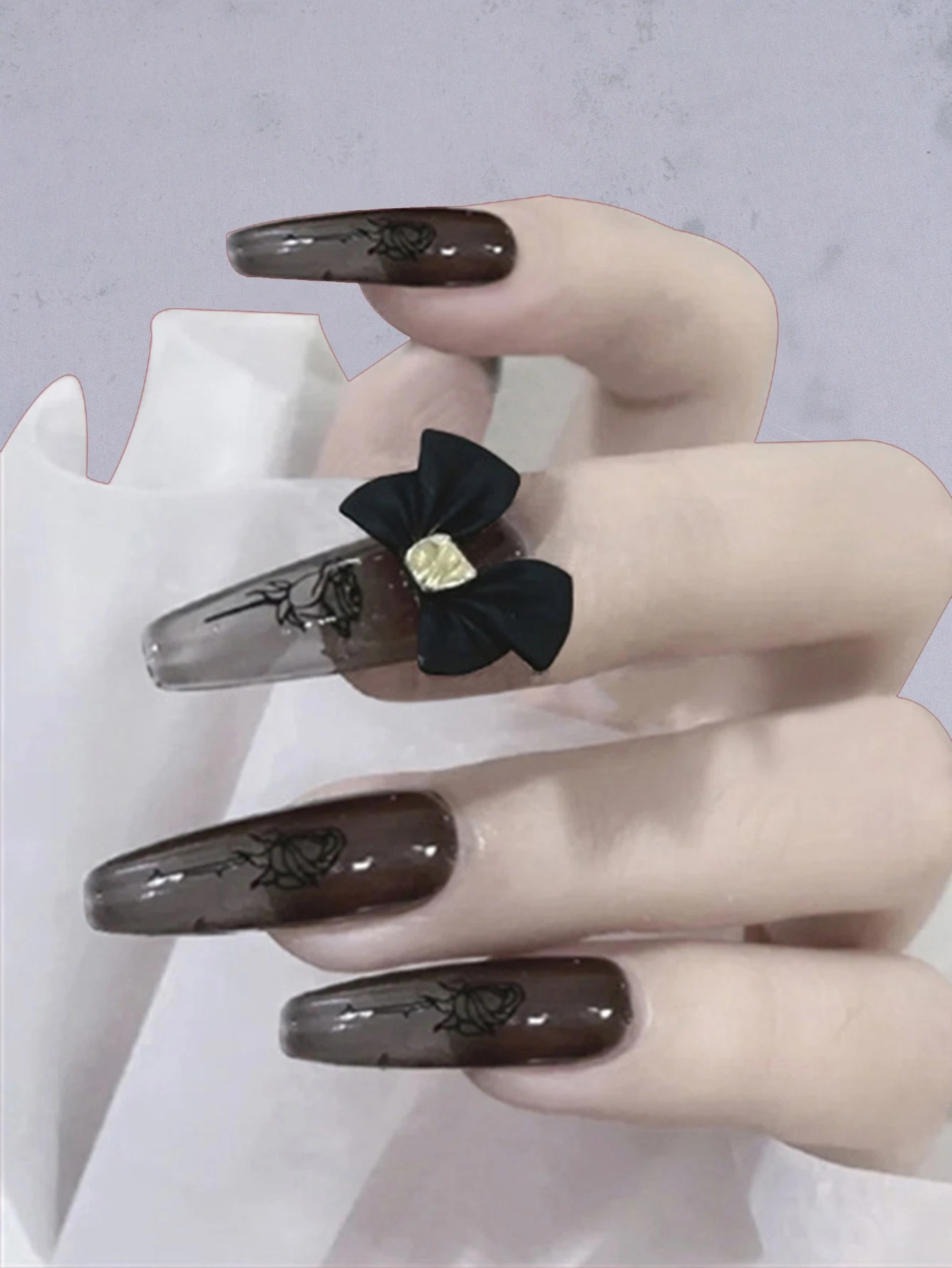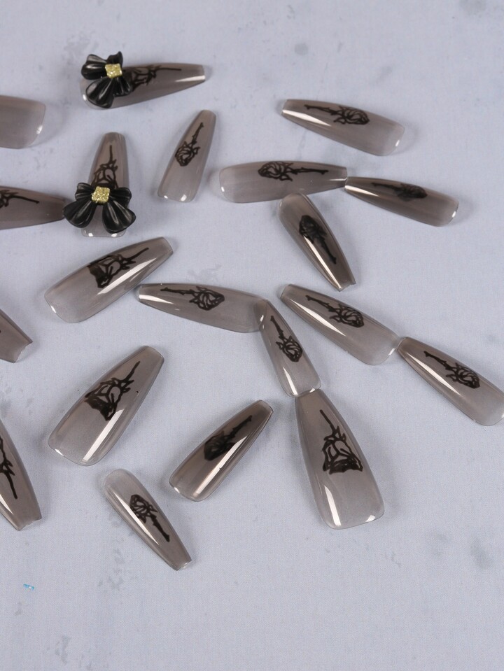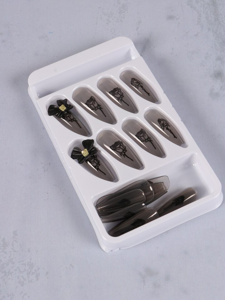 Kawaii 24pcs Long Coffin Bow Decor Fake Nail & 1sheet Tape