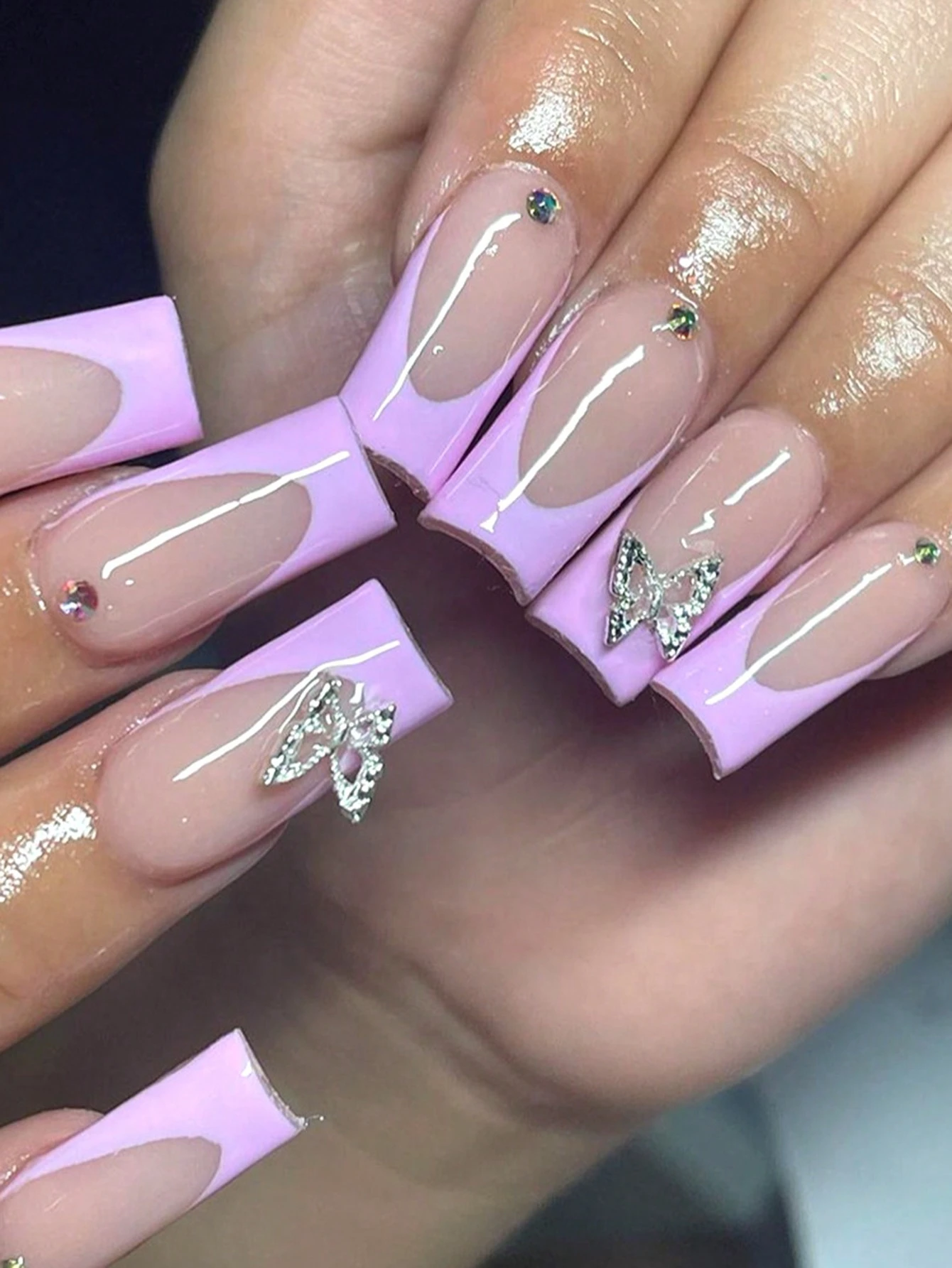 Kawaii 24pcs Long Coffin Rhinestone Decor Colorblock Fake Nail & 1sheet Tape & 1pc Nail File