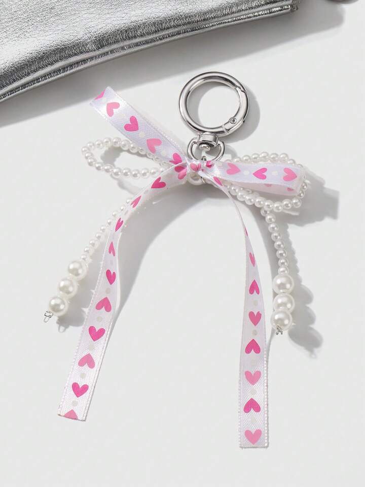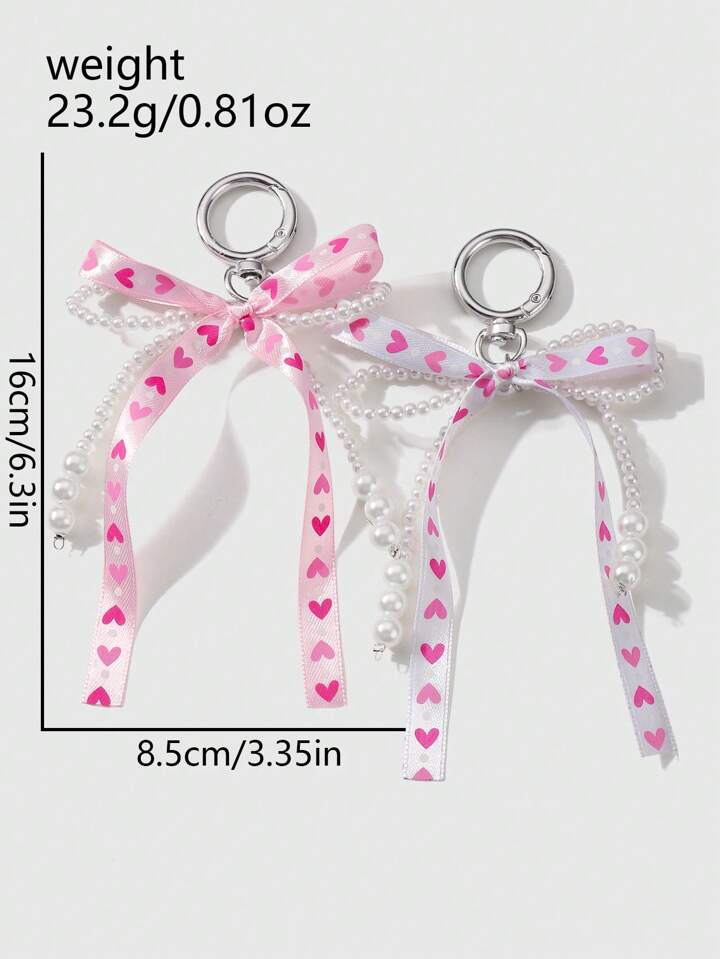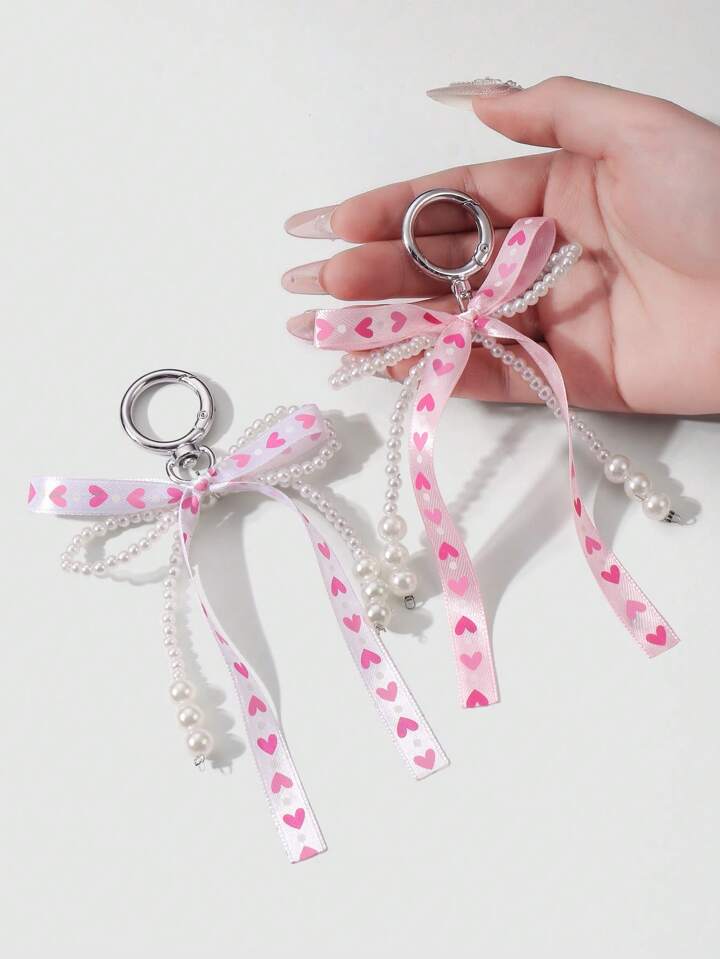 Kawaii 2pcs Cute & Delicate Girl Fashionable Handmade Beaded White Pearl, Pink Heart, Bowknot Keychain & Bag Charm Combo Set, Suitable For Couple, Best Friend, Sisters, Daily Wear, Holiday Gift