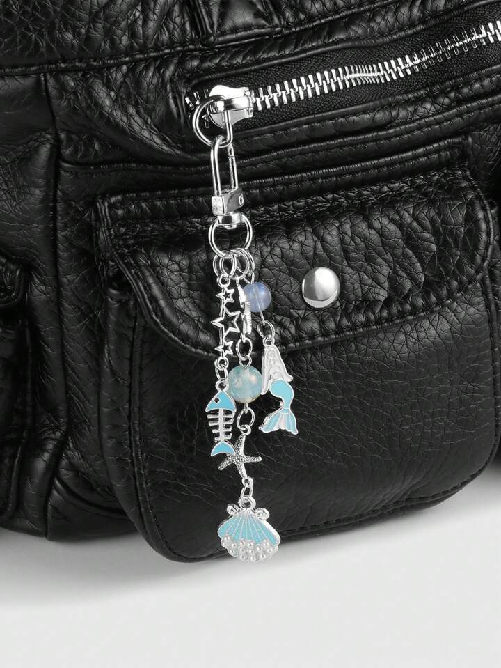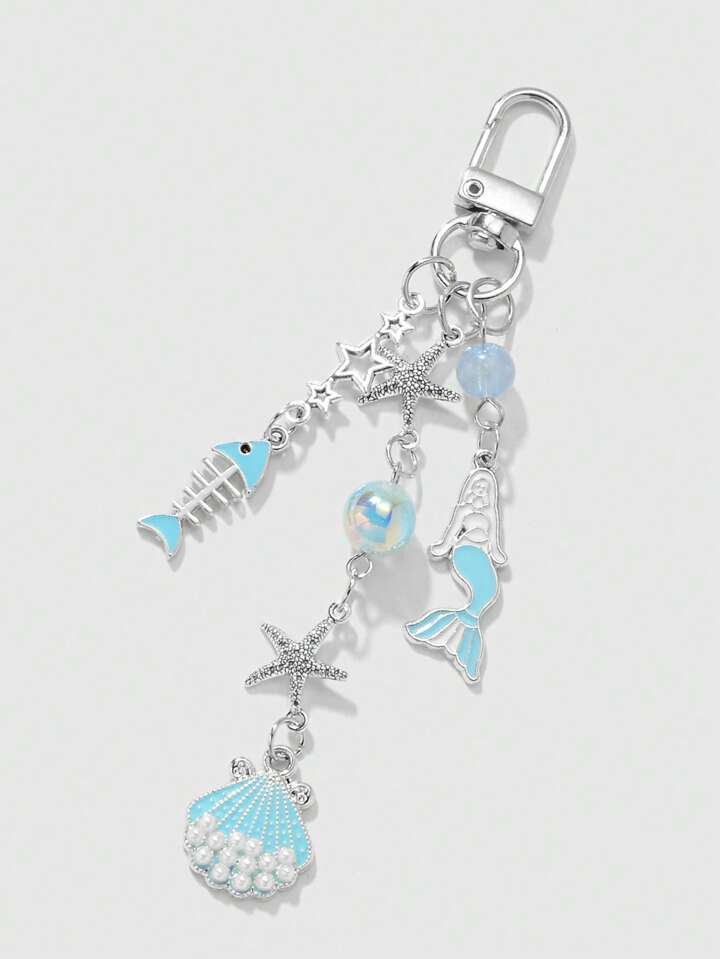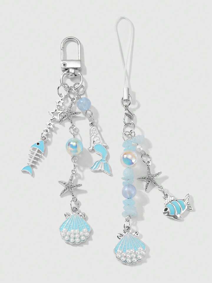 Kawaii 2pcs Elegant & Fashionable Blue Ocean Series Jewelry Set: Hollow Silver Star, Round Ball, Fishbone, Faux Pearl And Shell Pendants, Includes Phone Holder, Keychain, Bag Charm, Mobile Hanger - Suitable For Couples, BFFs, Dailywear Or Gifting