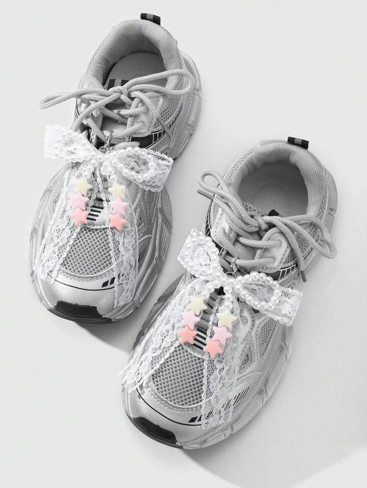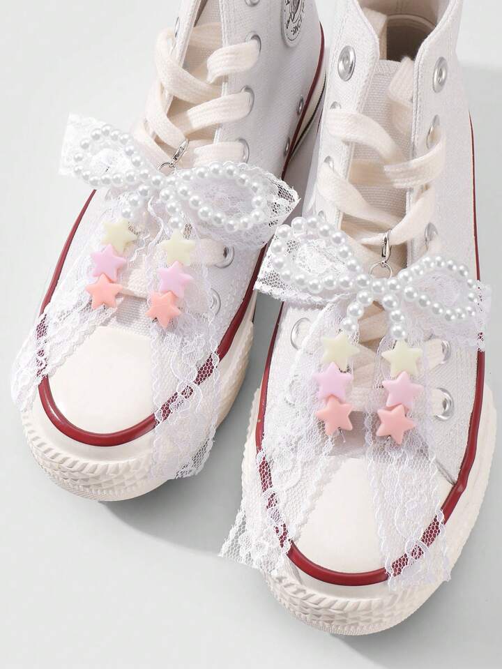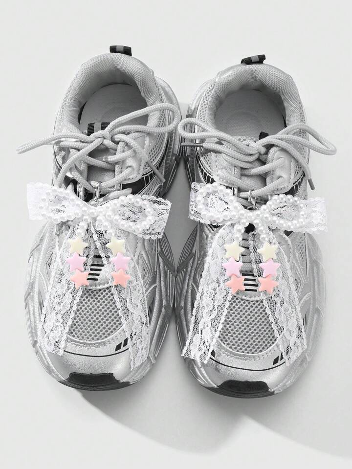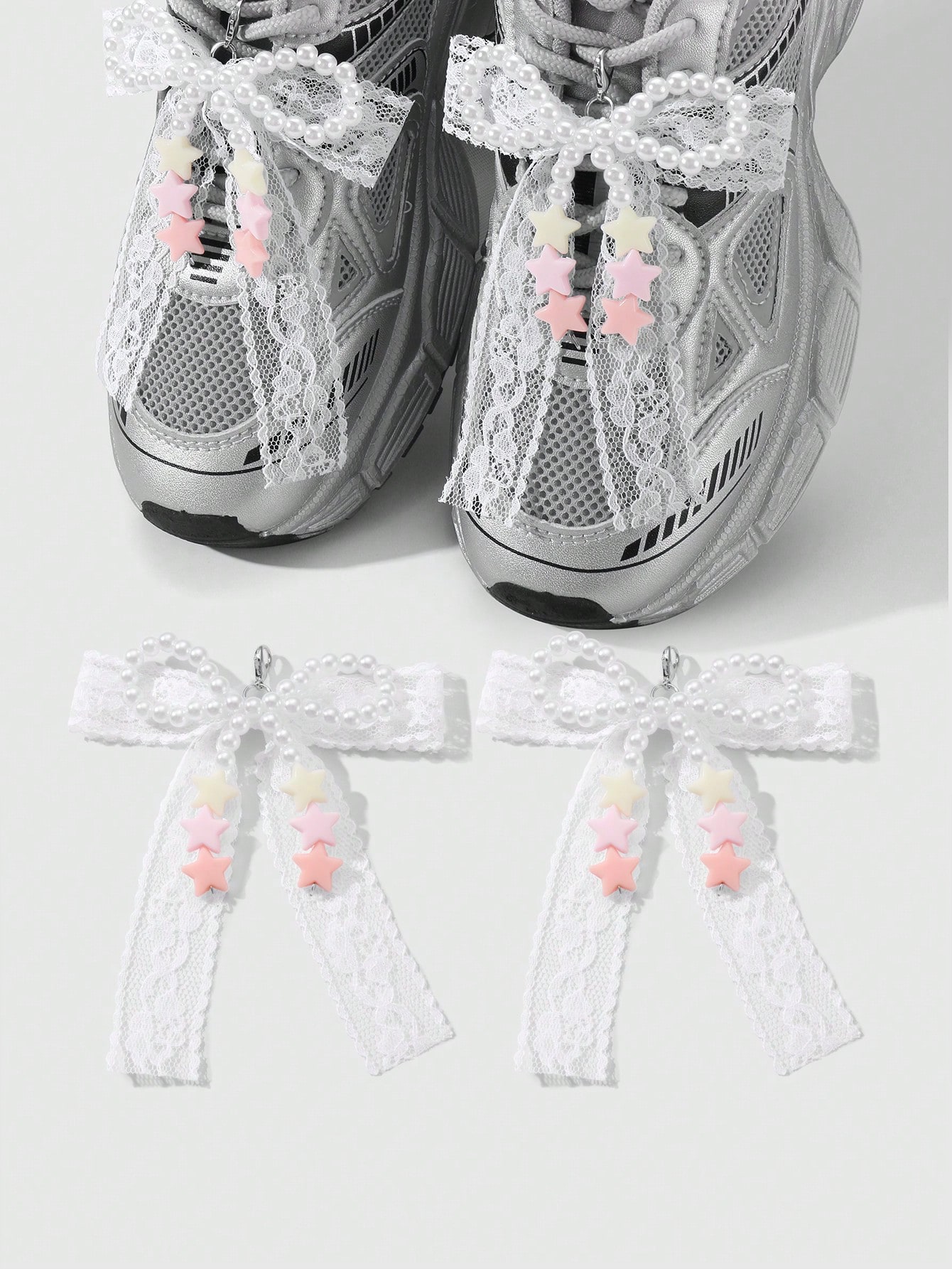 Kawaii 2pcs Elegant Minimalist Cute High-Quality Handmade Beaded White Faux Pearl Resin Star, Tulle Bow DIY Shoe Clips Decorative Set, Suitable For Women/Girls Daily Wear, Holiday Gift