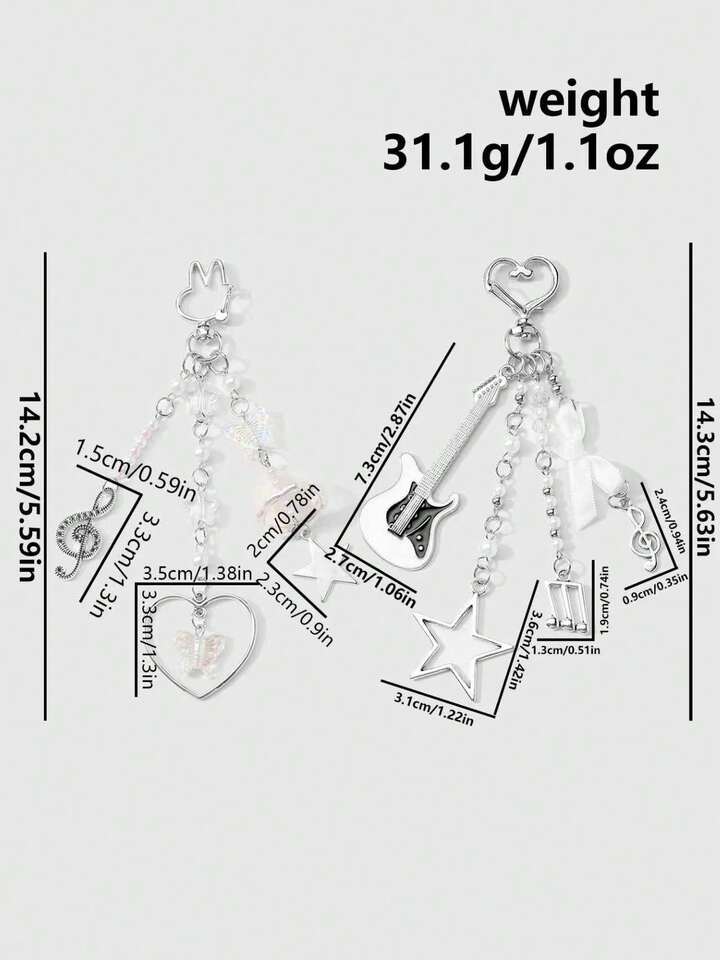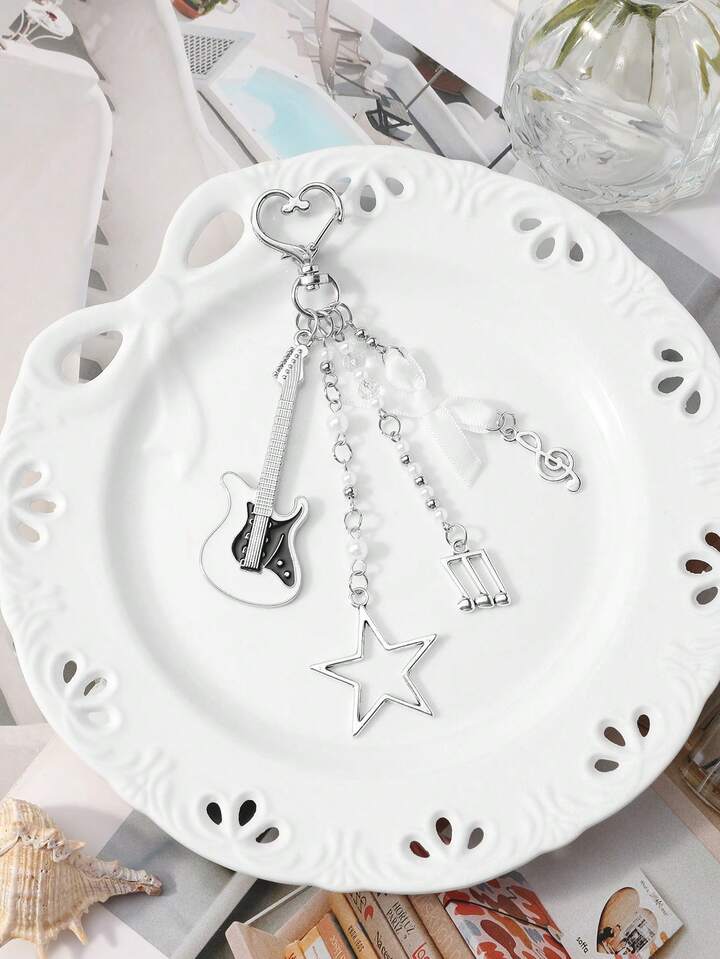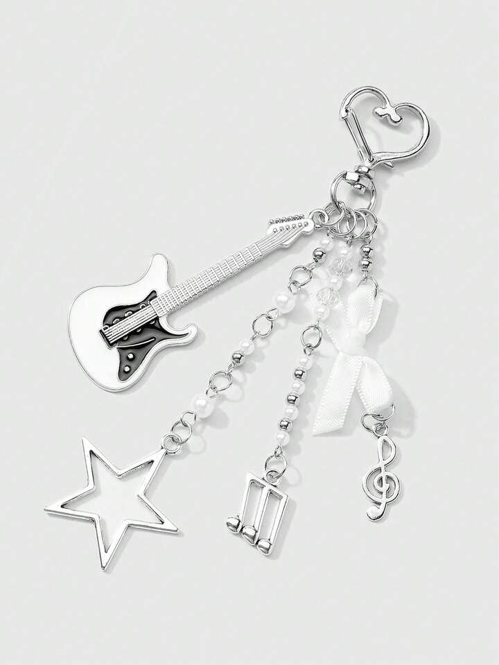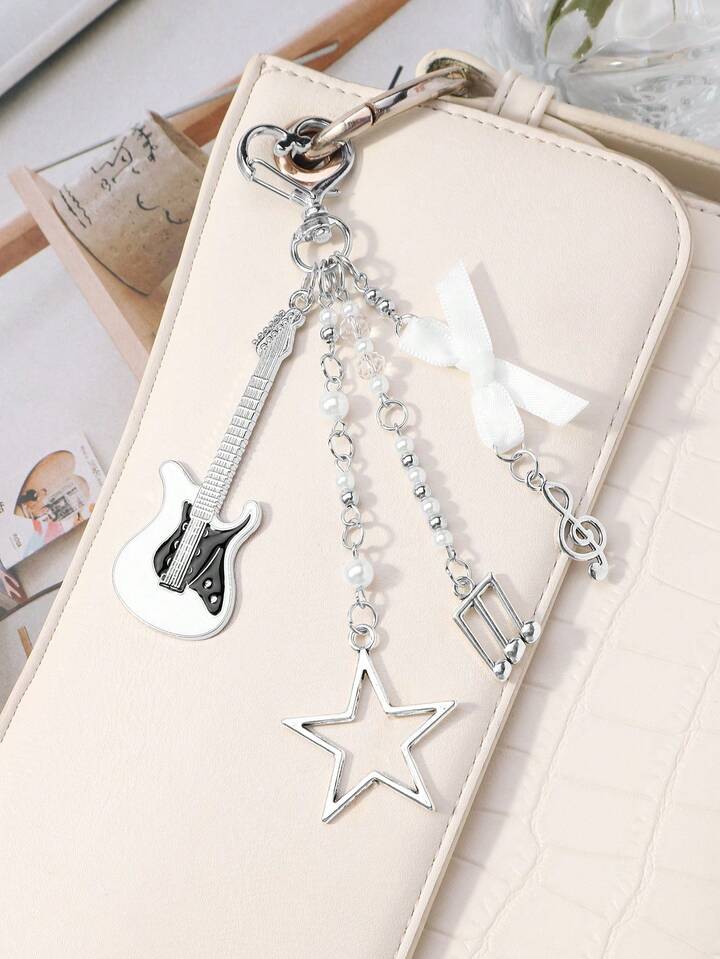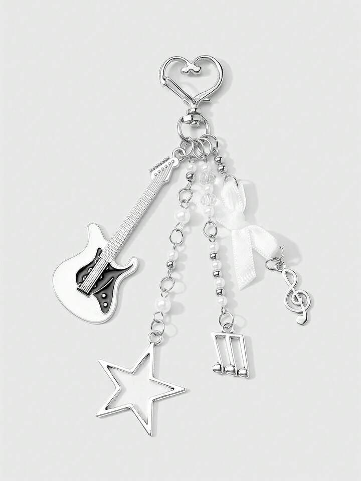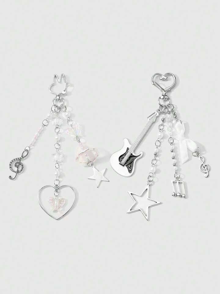 Kawaii 2pcs Fashionable & Versatile Silver Chain Faux Pearl Resin Star, Heart, Butterfly, Acrylic Wind Chime, Music Note, Bow Tie, Black & White Electric Guitar Pendant DIY Keychain, Bag Charm, Suitable For Sisters, Best Friends, Couples, Daily Wear, Holiday Gifts