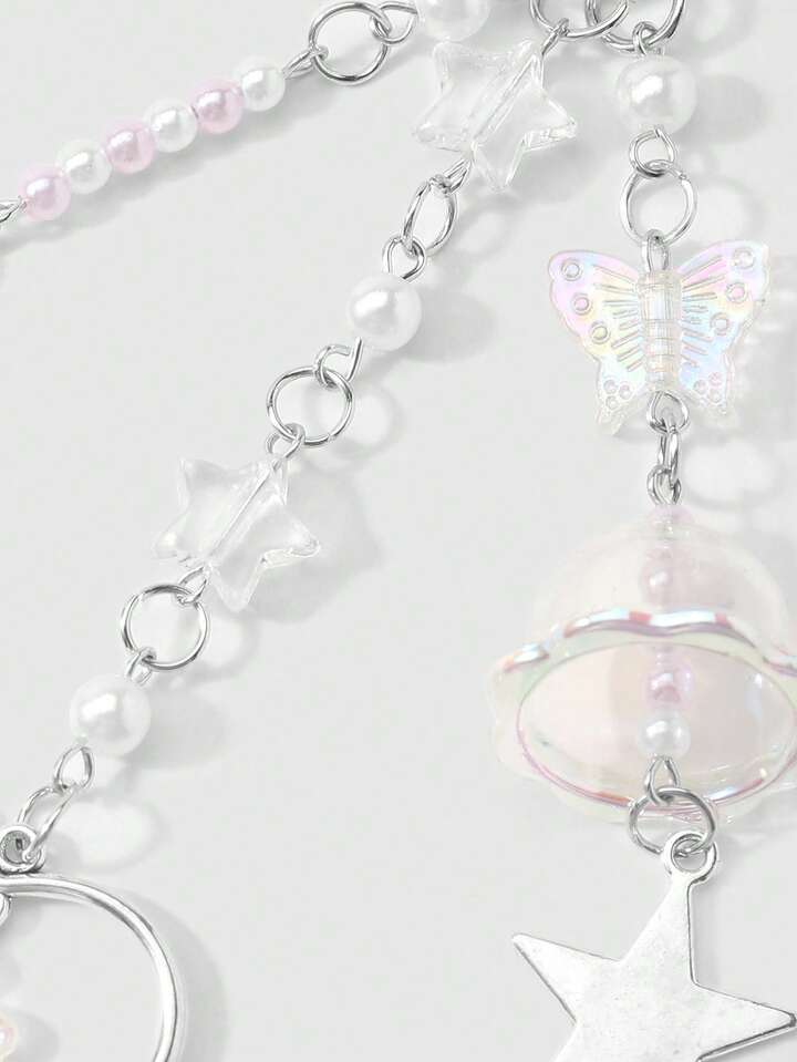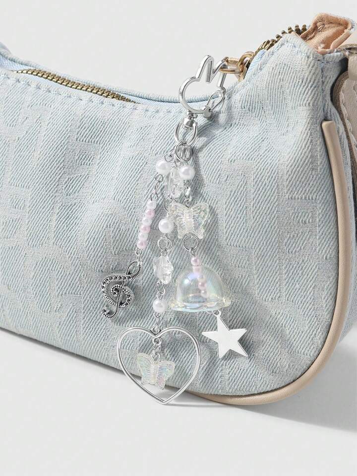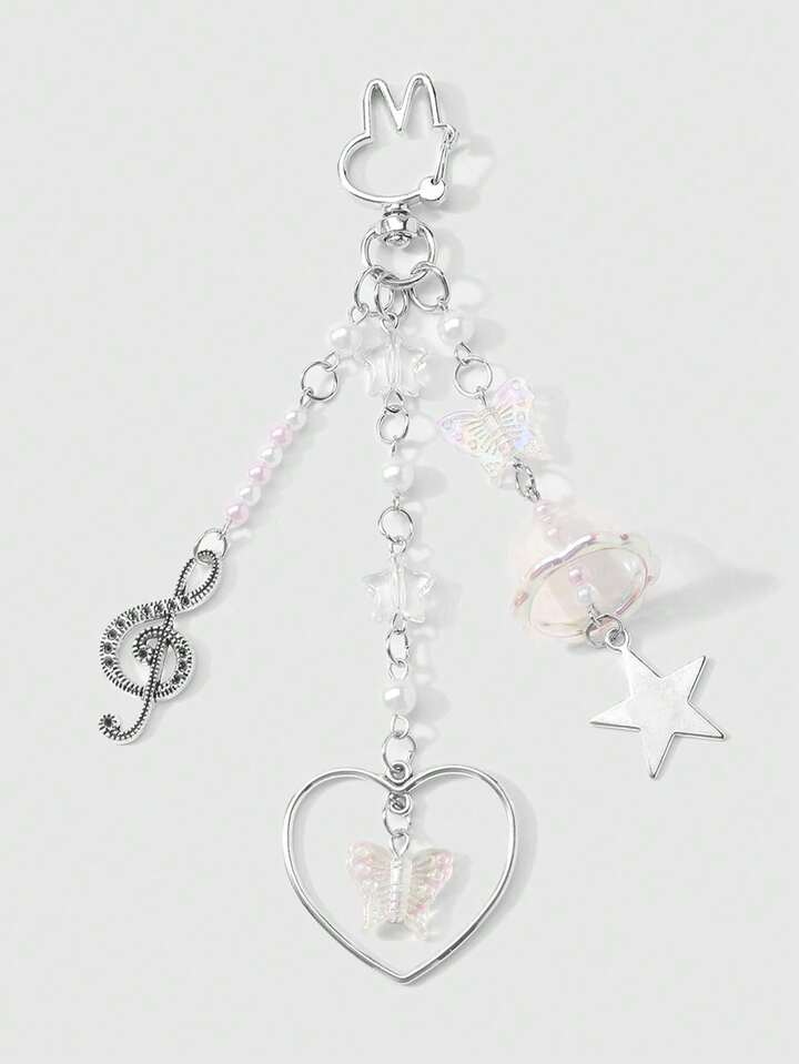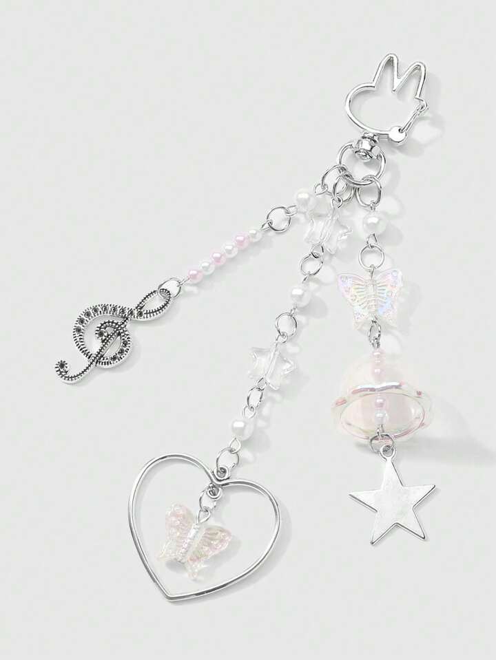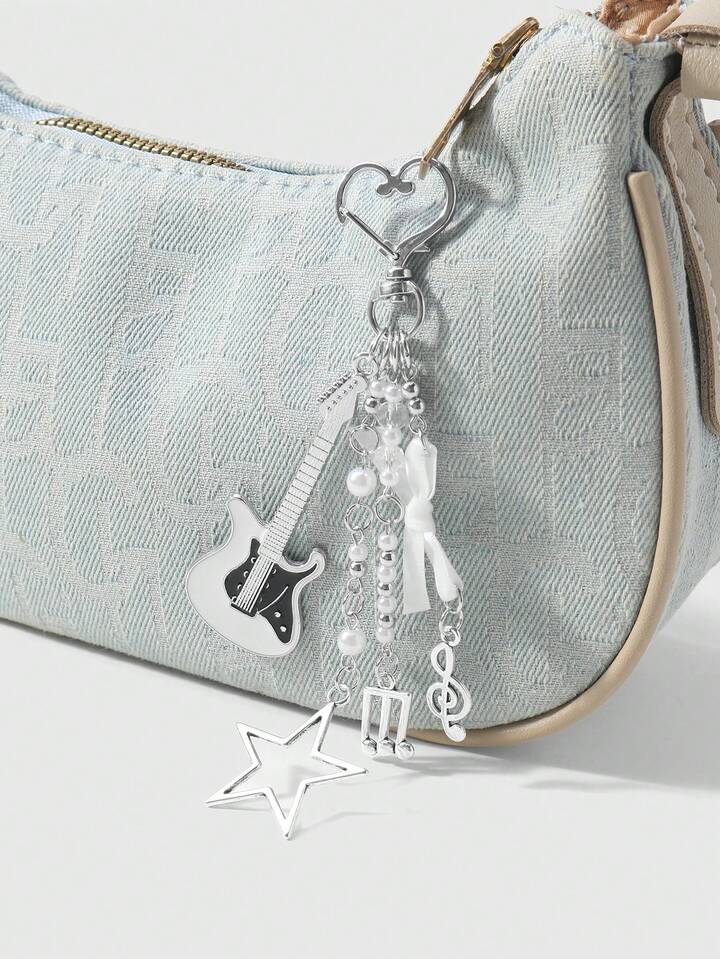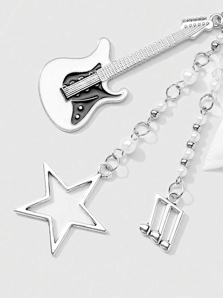 Kawaii 2pcs Fashionable & Versatile Silver Chain Faux Pearl Resin Star, Heart, Butterfly, Acrylic Wind Chime, Music Note, Bow Tie, Black & White Electric Guitar Pendant DIY Keychain, Bag Charm, Suitable For Sisters, Best Friends, Couples, Daily Wear, Holiday Gifts