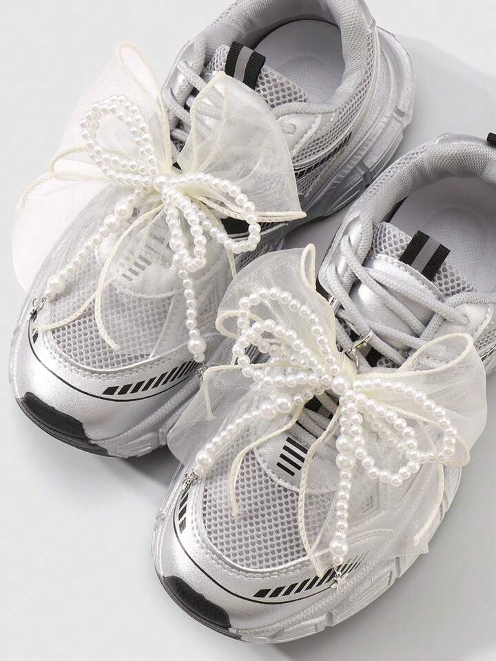 Kawaii 2pcs Korean Style Minimalist Fashion Handmade Beaded White Faux Pearl, Yellow Mesh Double Layered Bow, Star Pendant Shoe Decorations Combo Set, Suitable For Women, Daily Wear Or Gift