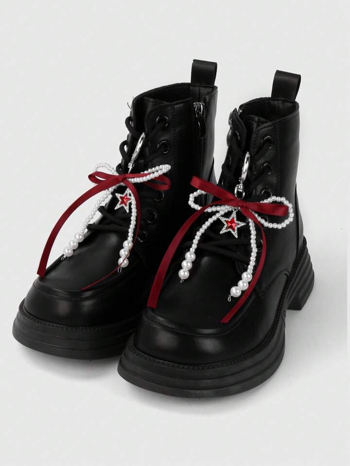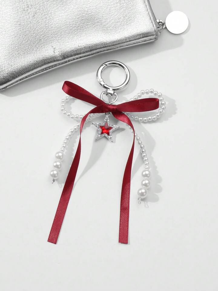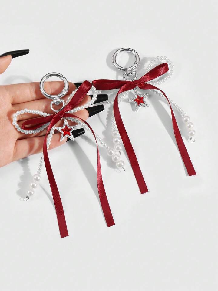 Kawaii 2pcs/Set Handmade Beaded Accessories - White Faux Pearl, Burgundy Ribbon Bowknot, Glass Rhinestone Star Decorations, Fashion & Elegant, Suitable For Women Daily Wear Or Gifts