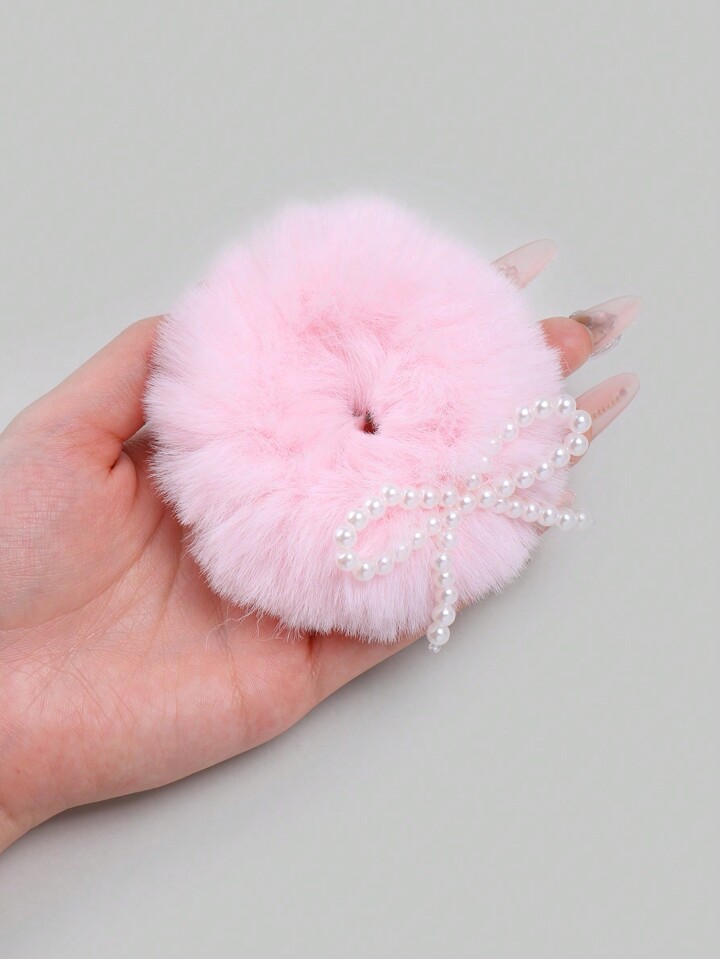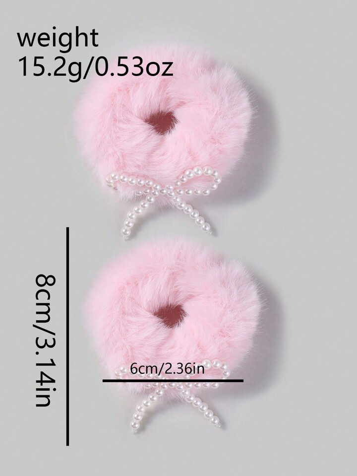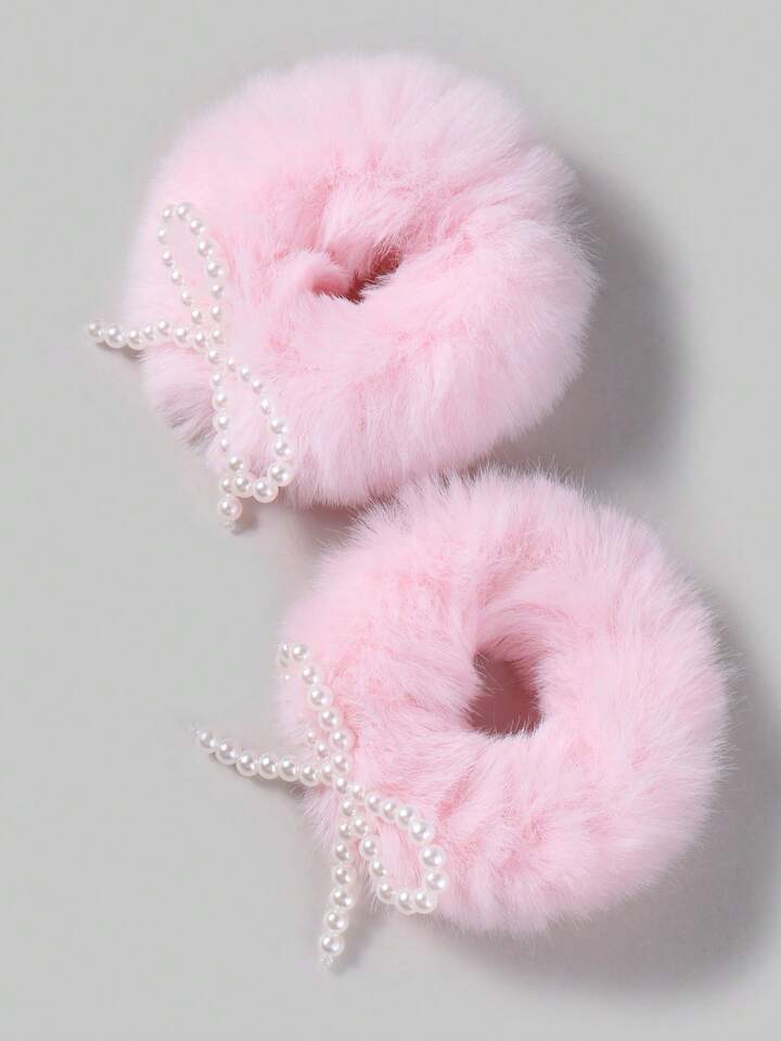 Kawaii 2pcs/Set Korean Style Elegant Cute Fashion Versatile Handmade Pearl & Plush Bow Hair Scrunchies, Suitable For Women & Girls Everyday Wear, Holiday Gift