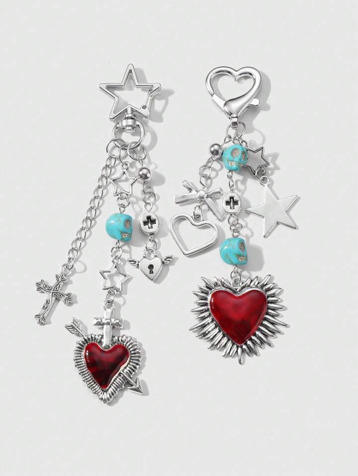 Kawaii 2pcs Y2K Fashion Gothic Stylish Heart, Star, Cross, Skull, Arrow Pendant Keychain Bag Decor, Suitable For Women Daily Wear, Holiday Gift