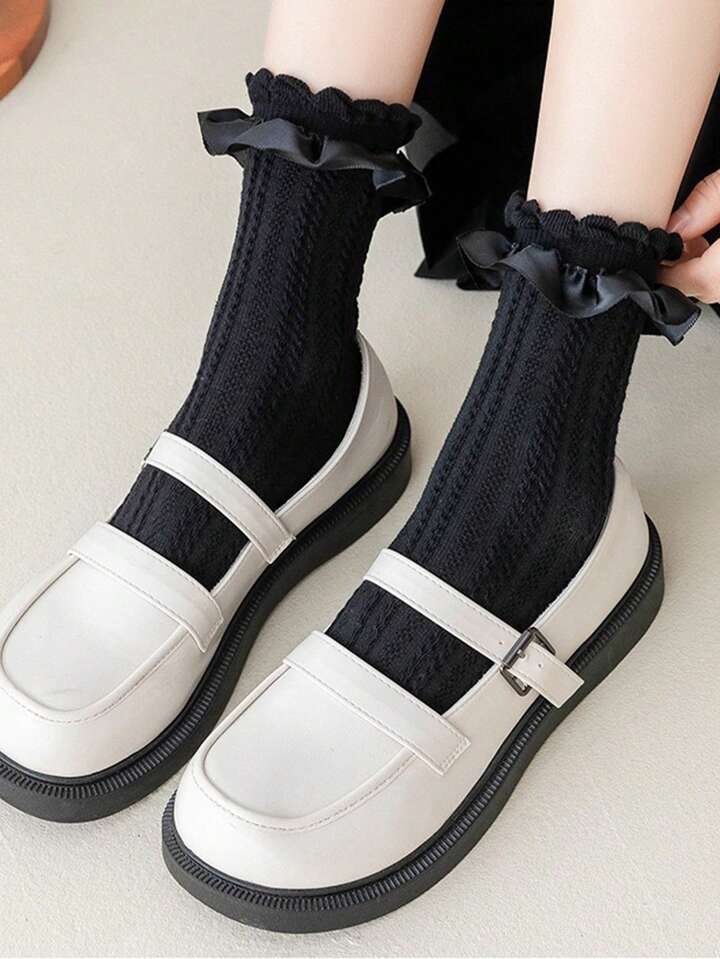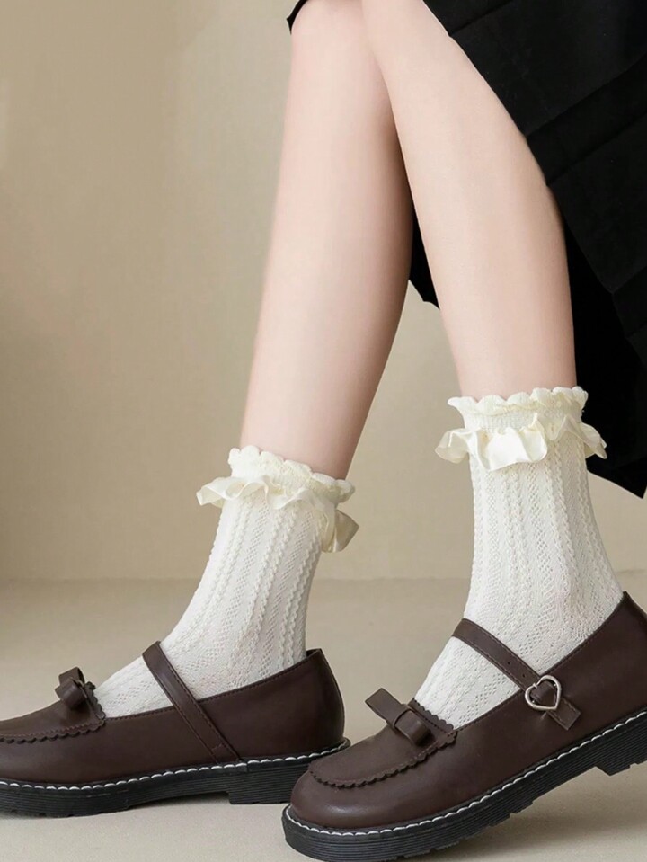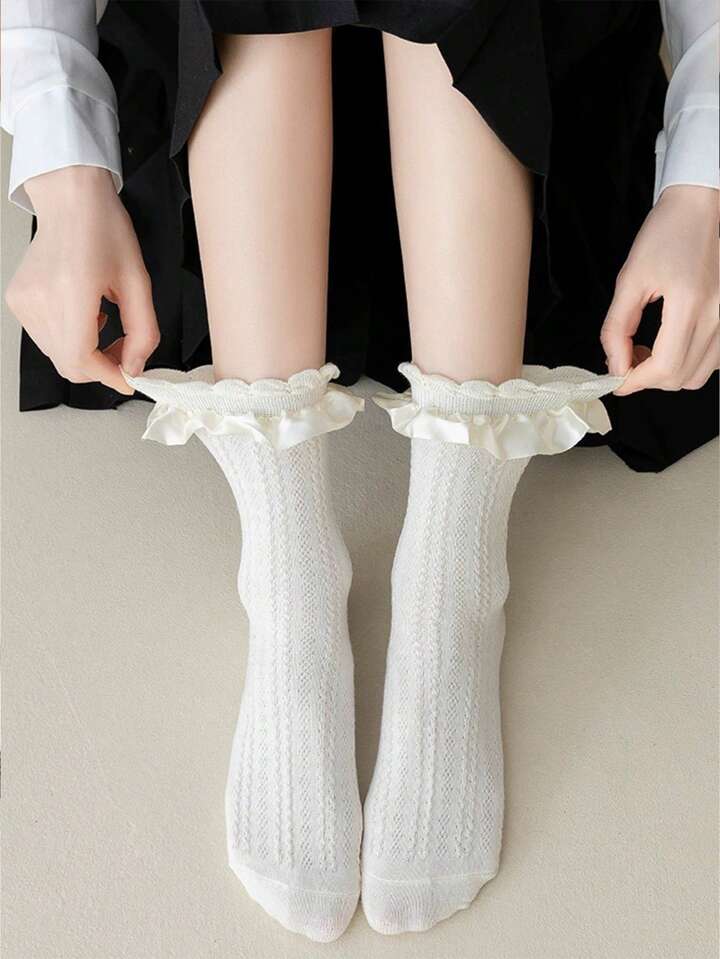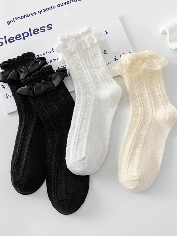 Kawaii 3 Pairs Random Color Lolita Combination Socks, JK Lace Trim Mid-Calf Socks, Solid Color Everyday Casual Mid-Calf Socks For Women