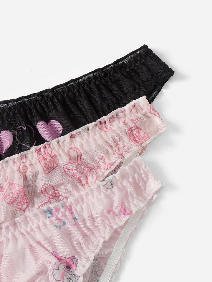 Kawaii 3pack Floral & Cartoon Graphic Lettuce Trim Panty Set