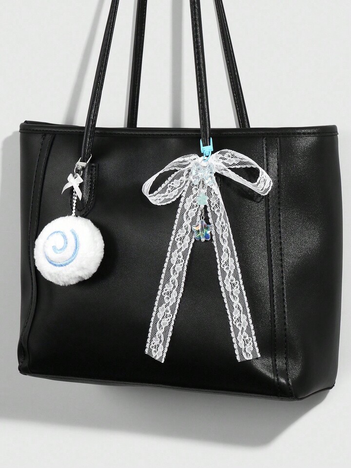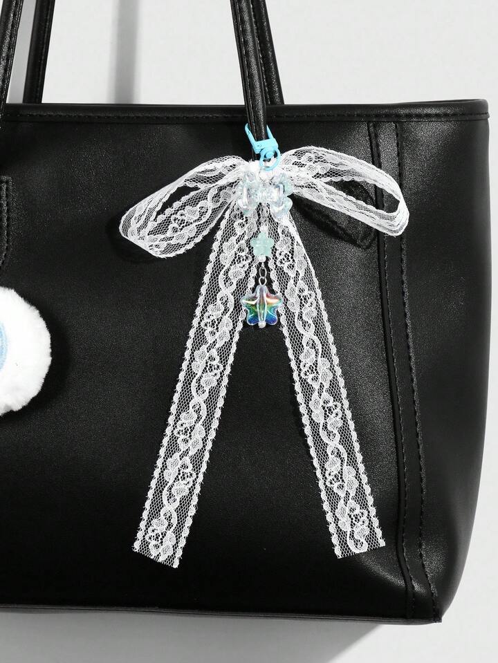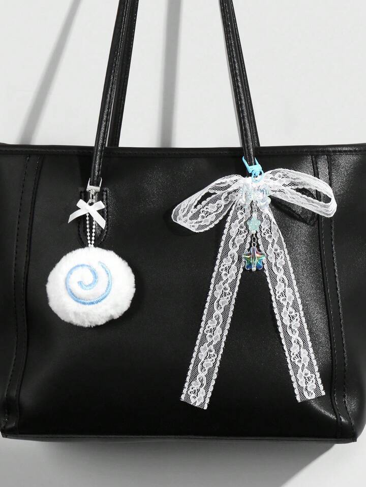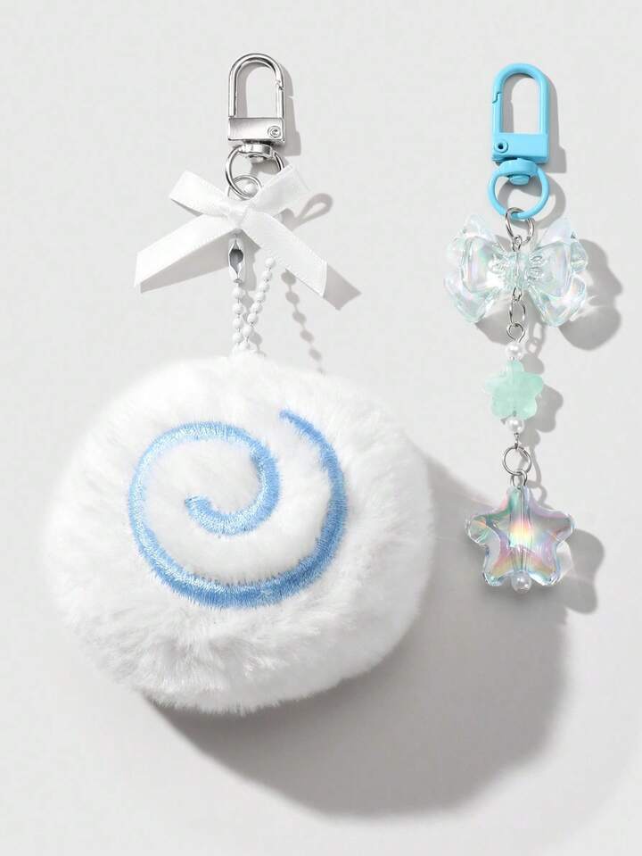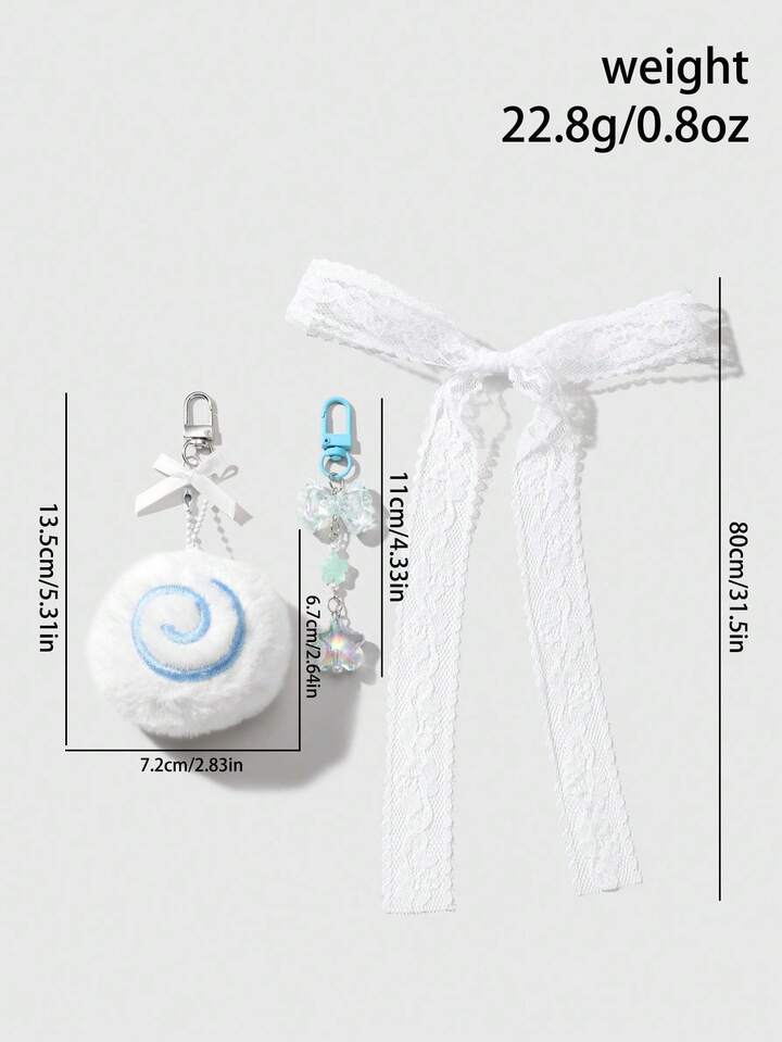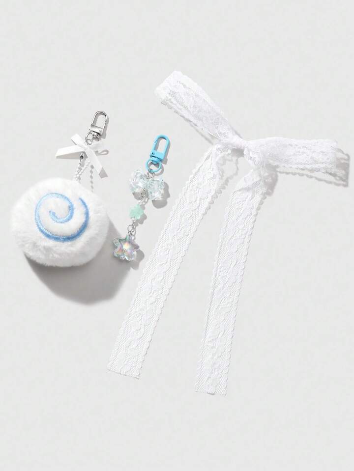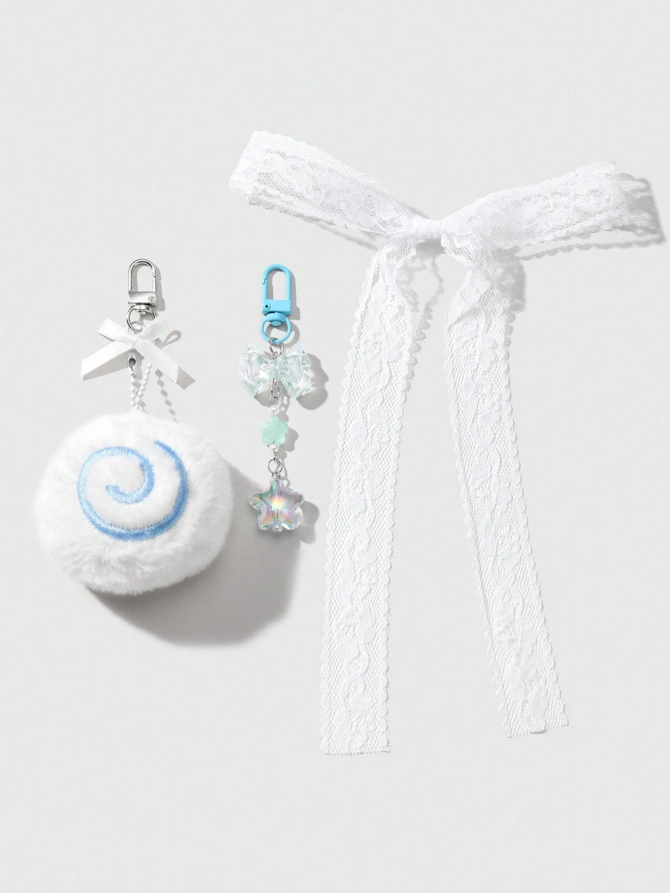 Kawaii 3pcs Minimalist Cute Sweet Versatile High-Quality Blue Plush Fish Cake Swirl Resin Bow Flower Star + 80cm White Lace Headband Combo Set, DIY Keychain Bag Pendant, Suitable For Women, Daily Wear, Holiday Gift