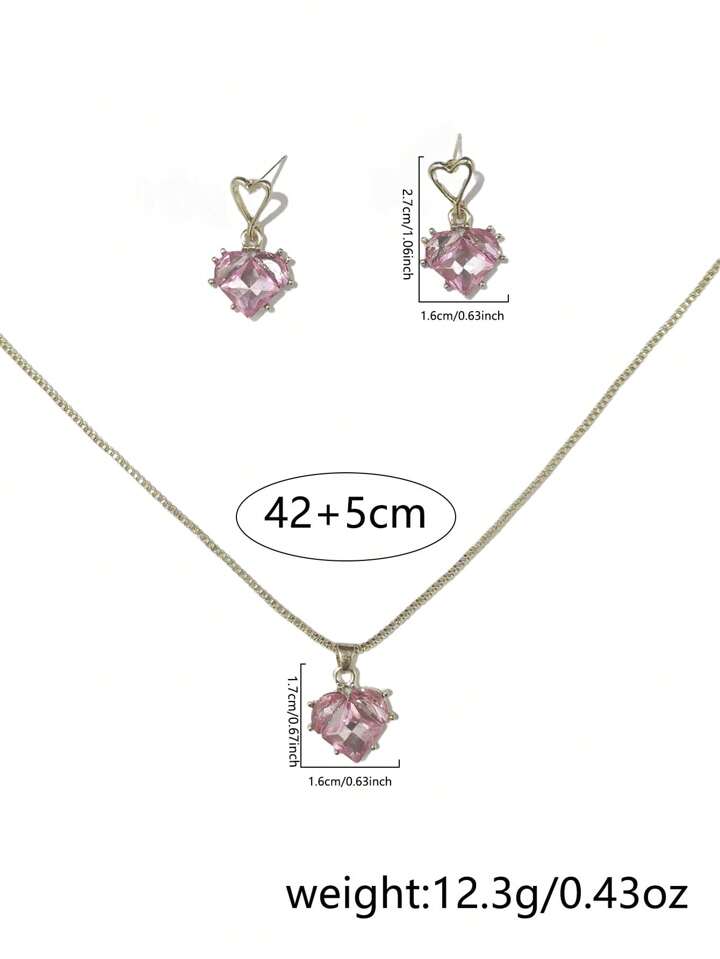 Kawaii 3pcs/Set Pink Rhinestone Inlaid Heart Shaped Dangle Earrings And Pendant Necklace For Women
