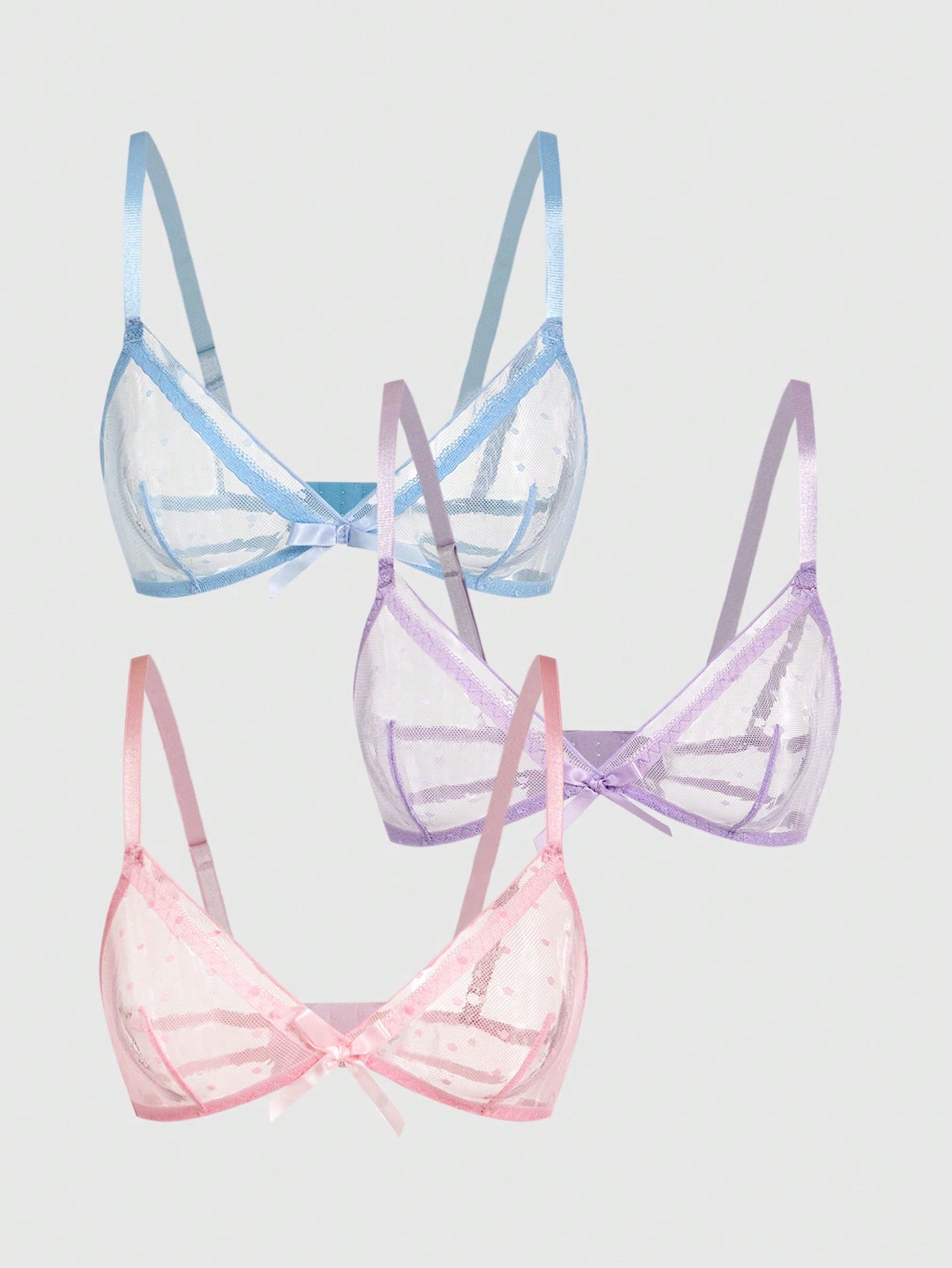 Kawaii 3pcs Set: Sweet Rustic Mesh Jacquard Fabric Contrast Color Patchwork Bow Decor Sheer Triangle Cup Bralette Lingerie Set