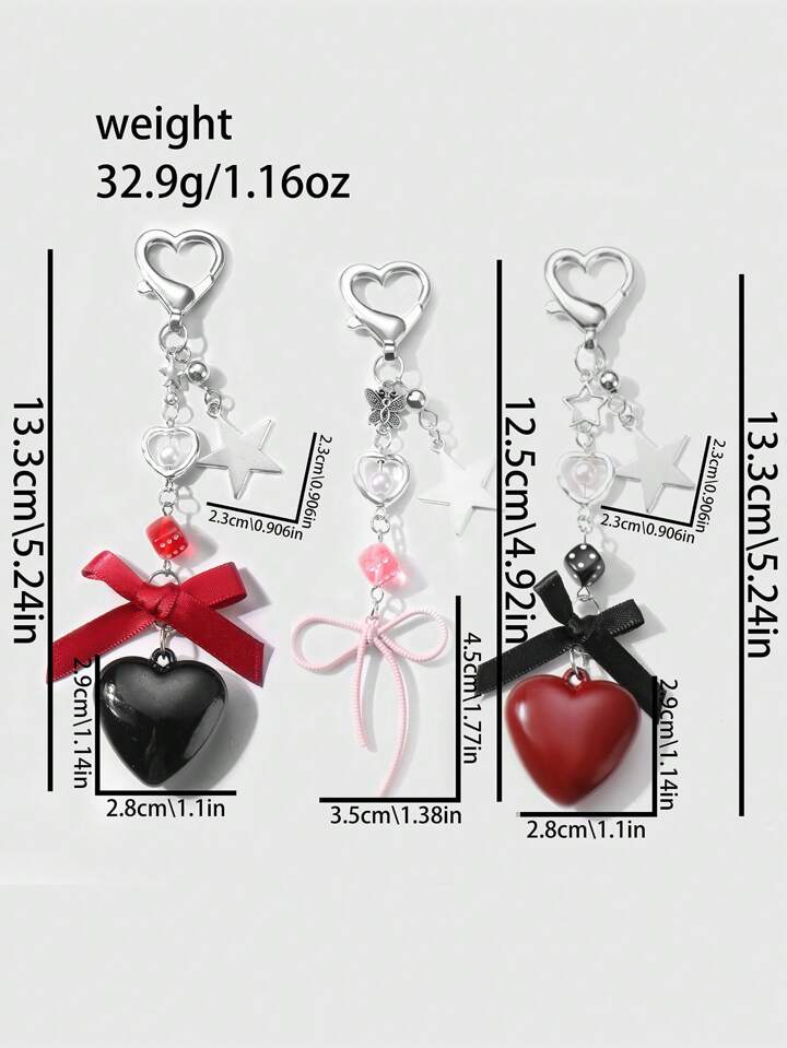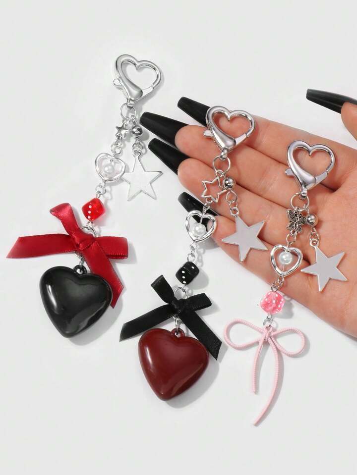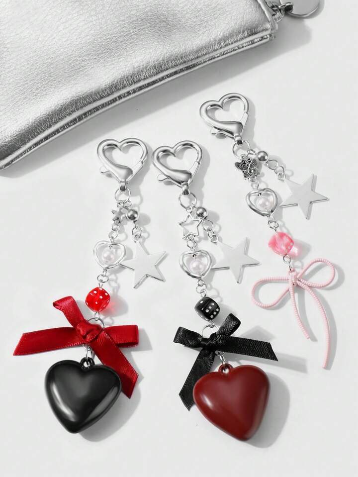 Kawaii 3pcs Y2K Fashionable Chic Aesthetic Silver Chain, Faux Pearl, Dice, Star, Ribbon, Acrylic Bow, Heart Pendant Keychain & Bag Charm Set, Women Daily Accessory, Holiday Gift