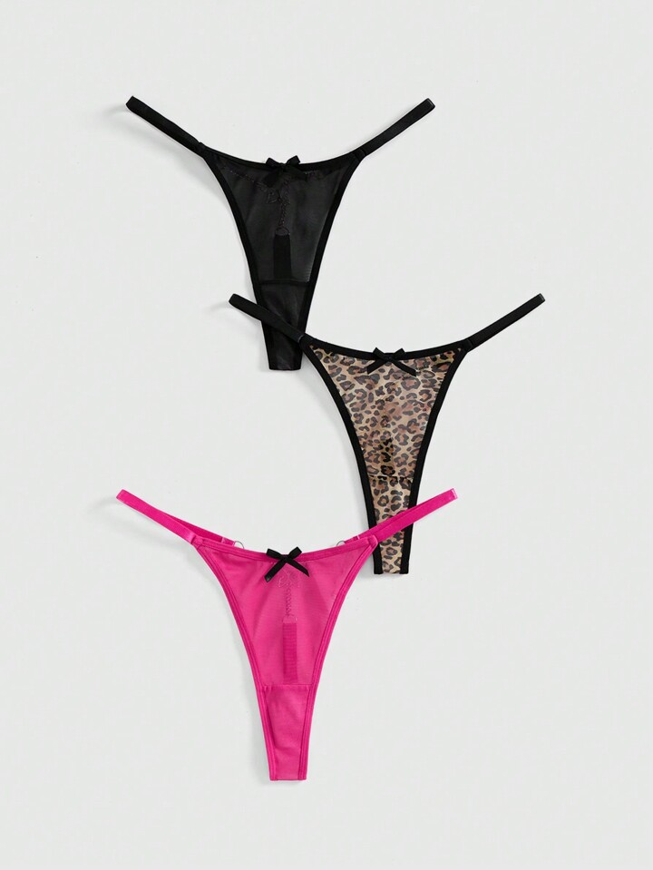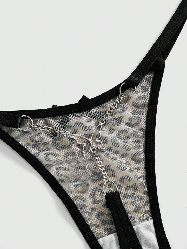 Kawaii 3pcs Y2K Gyaru Butterfly Metal Chain & Leopard Print Contrast Binding G-String Panties Set