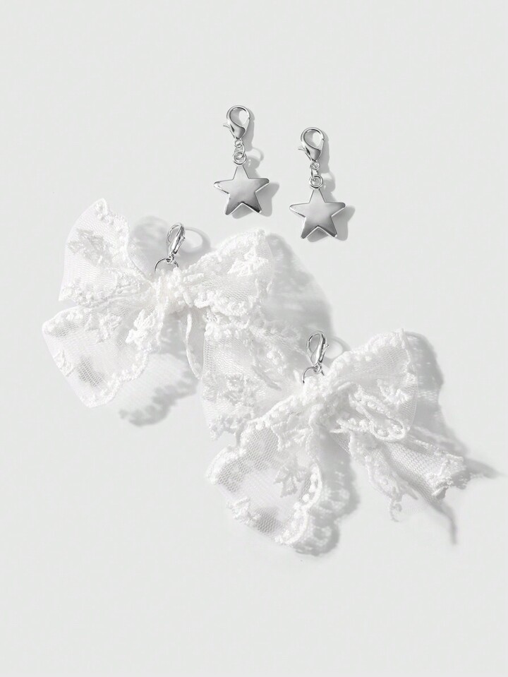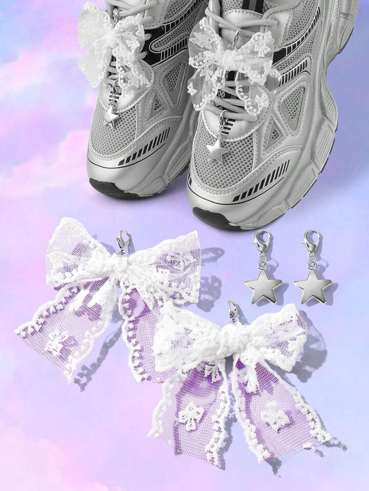 Kawaii 4pcs/Set Chic Minimalist Versatile Highly Attractive White Mesh Embroidered Lace Bow Decor CCB Star Shoe Clips Accessory Combination, Suitable For Women And Girls, Holiday Gift