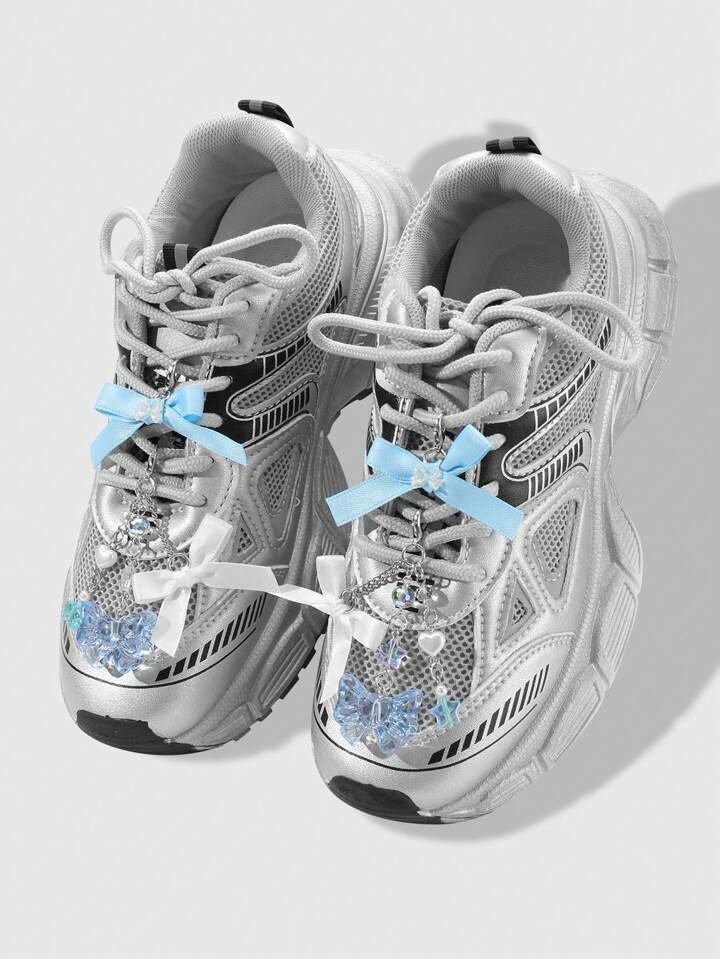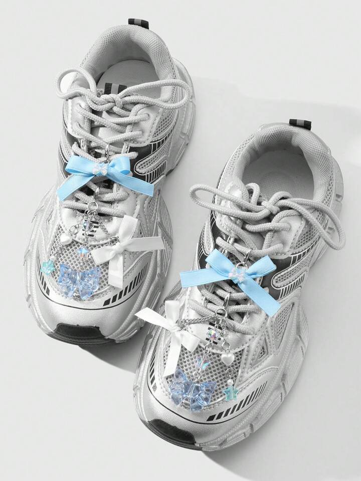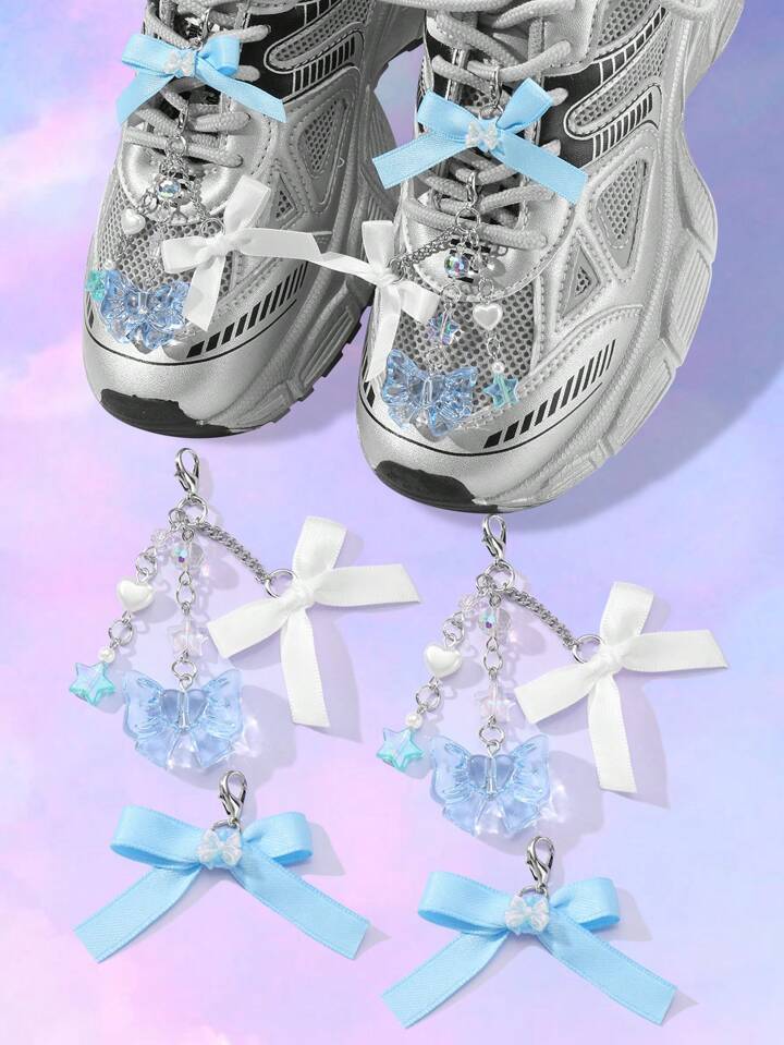 Kawaii 4pcs Set Elegant Minimalist Fresh Sweet High-Quality Silver Chain Resin Star + Fabric Bow DIY Shoe Clips Ornament, Suitable For Women Everyday Wear, Holiday Gift