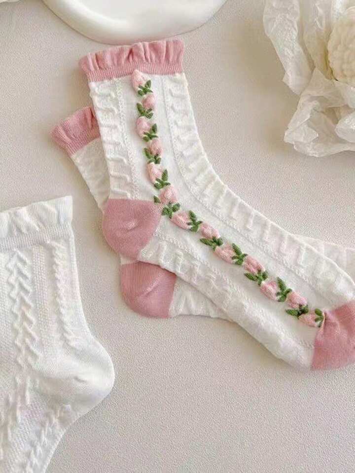 Kawaii 5pairs Women Floral Pattern Lettuce Trim Crew Socks