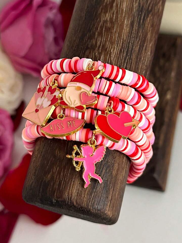 Kawaii 5pcs/Set Cute Pink Soft Clay Valentine's Day Bracelets, Handmade Stretchy Charm Bracelets With Y2K Style Angel Heart Pendant, Gift For Friends And Holidays