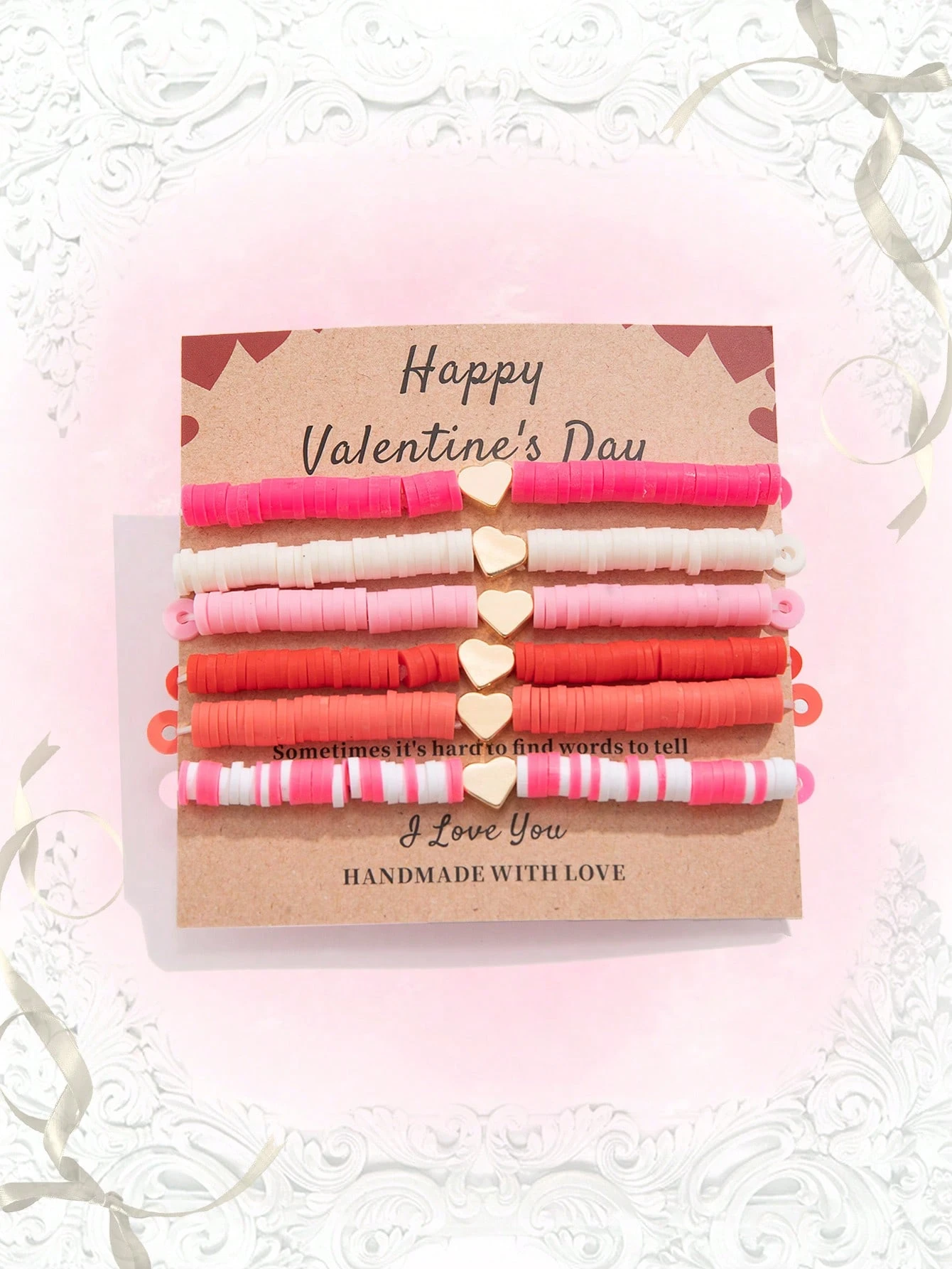 Kawaii 6pcs New Fashionable Minimalist Pink Valentine's Day Bracelets, Metal Heart Elastic Bangle, Party Gifts, Suitable For Gifts To Family, Friends, Classmates, Partners, Holiday Gifts
