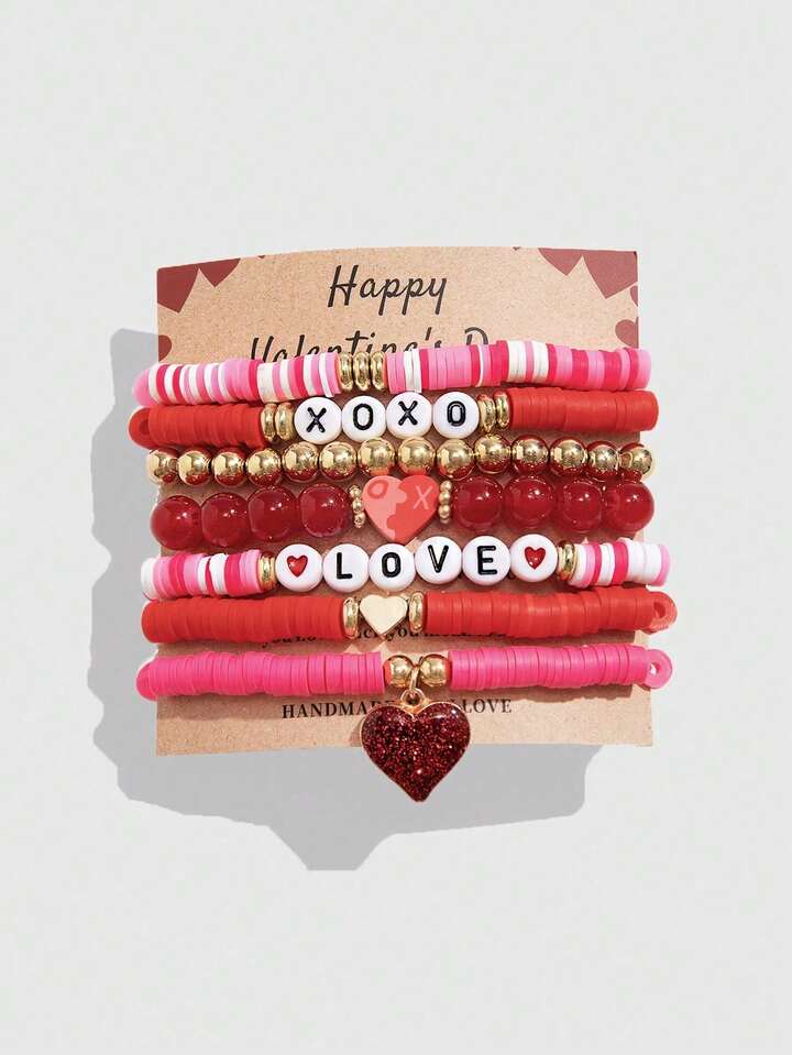 Kawaii 7pcs/Set Fashionable Sweet & Cute Heart Shaped Pendant & Beaded Alphabet Bracelet For Women Daily Wear, Valentine's Day & Friendship Gift,Mom,Mother,Mother's Day,Gift