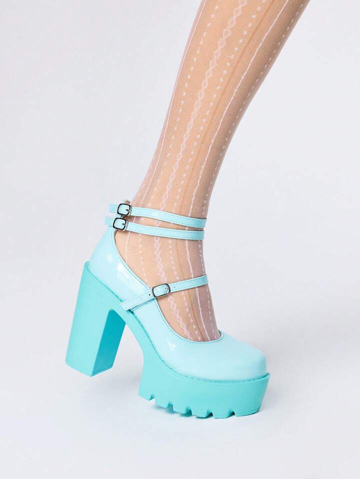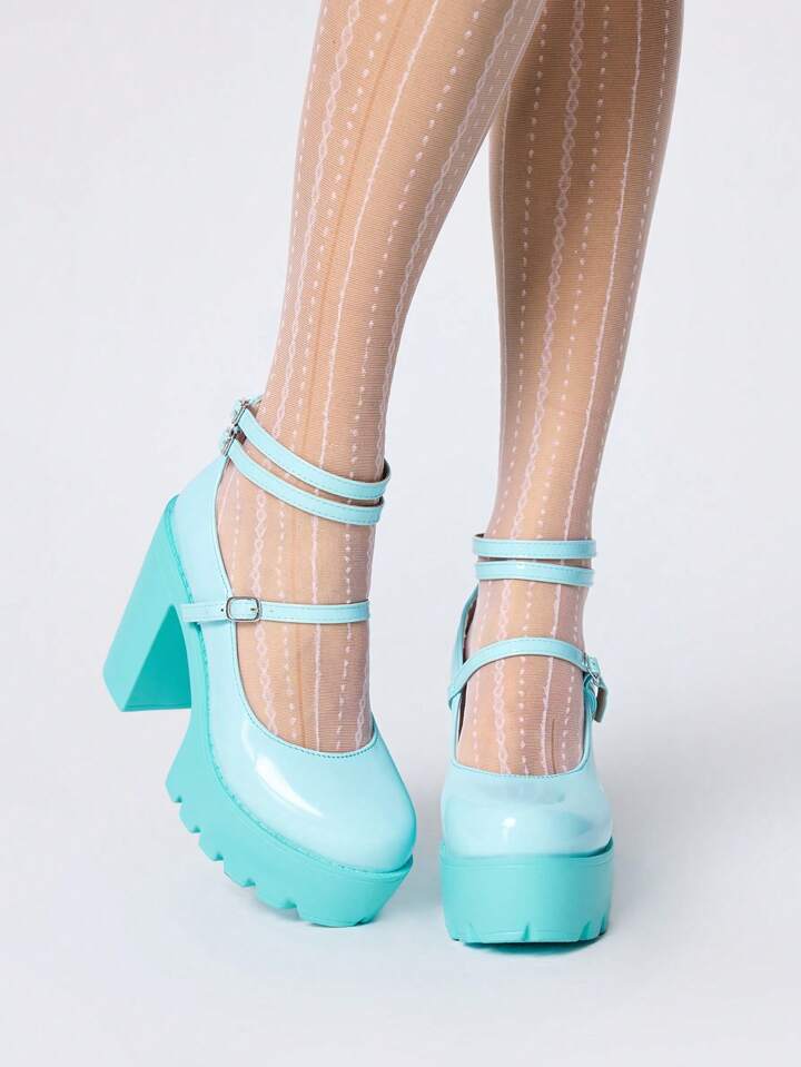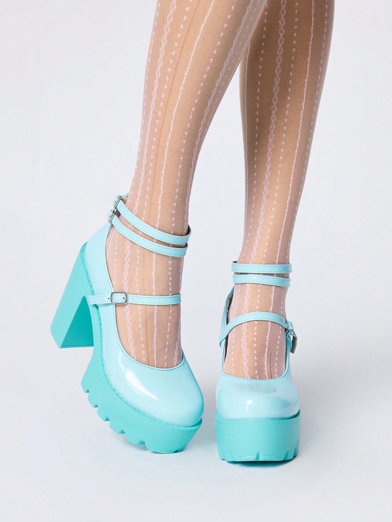 Kawaii Blue Closed Toe Mary Jane Platform Pumps, Chunky Heel With Ankle Strap, Party Formal Dress Shoes For Women
