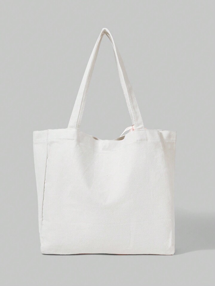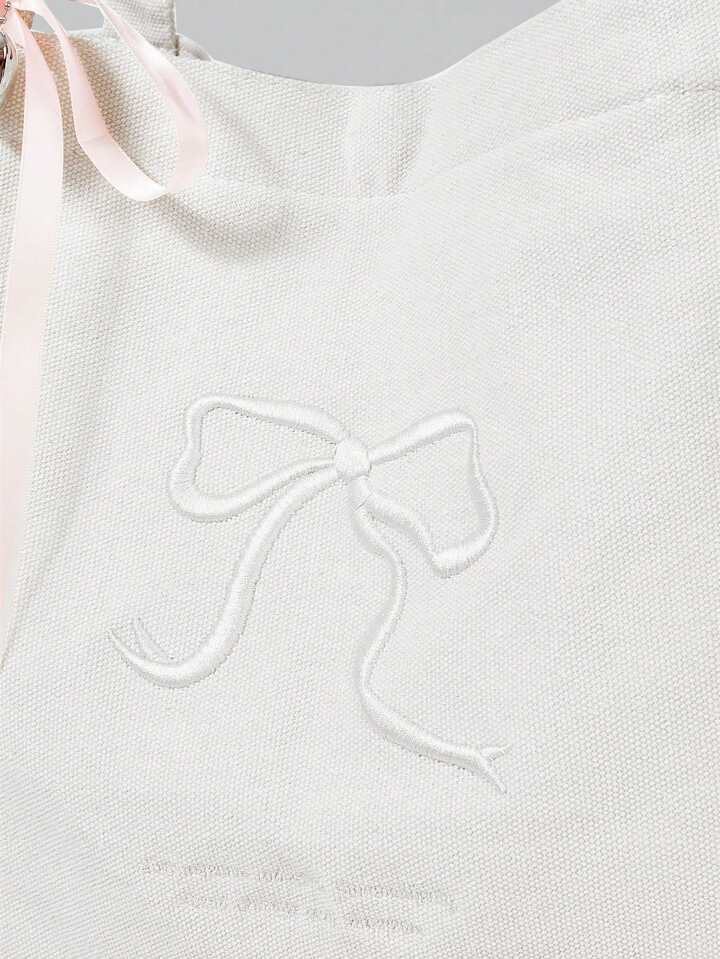 Kawaii Bow Embroidered Canvas Tote Bag + Pink Ribbon Bow Decor Ladies Handbag, Literary School Bag & Bookbag For Women Or Students, Perfect For Books, Shopping, Back To School And More