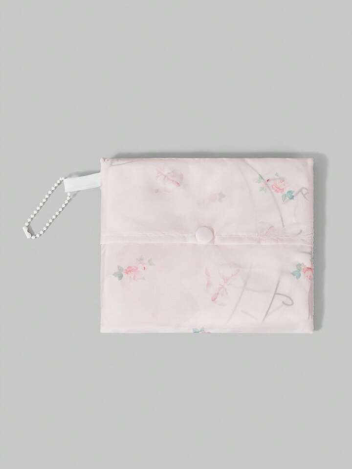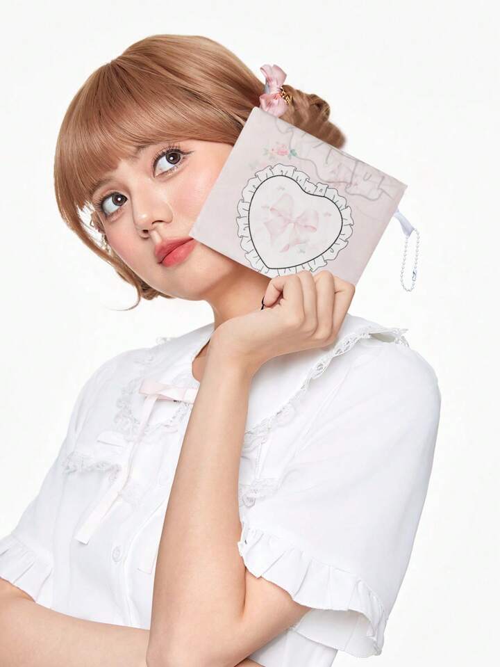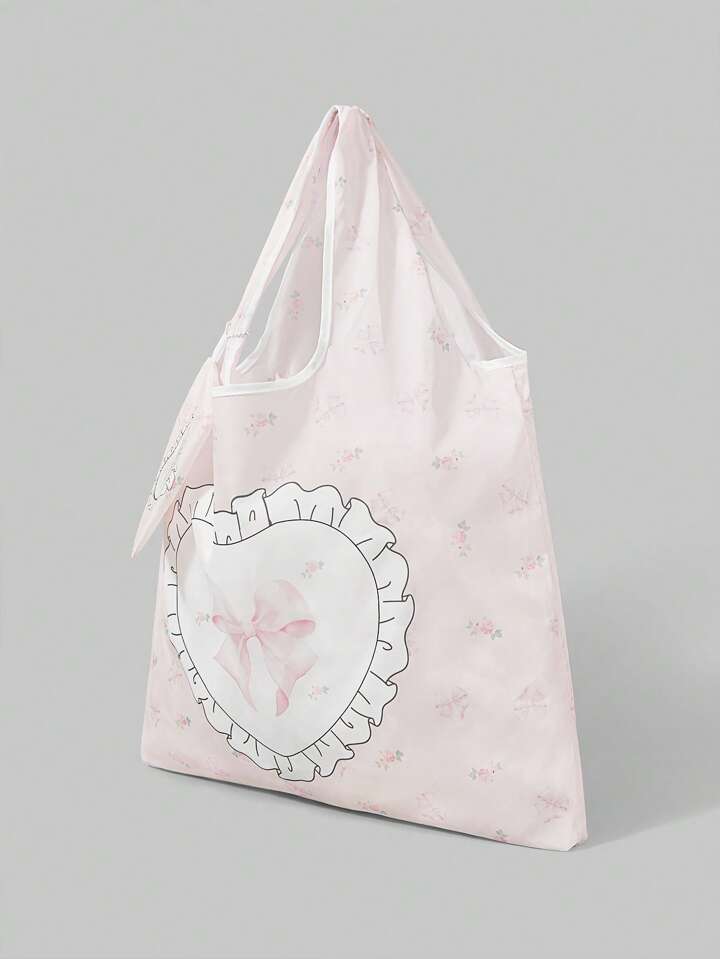 Kawaii Bowknot & Heart Lace Print Large Capacity Foldable Tote Bag With Zipper Pouch, 401422