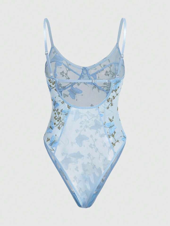 Kawaii Butterfly Embroidery Lace Up Mesh Underwire Teddy Bodysuit Lingerie