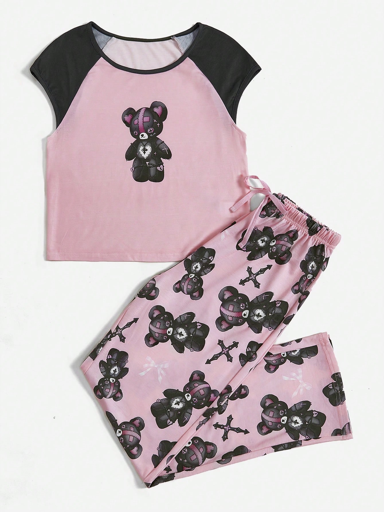 Kawaii Cartoon Bear Print Colorblock Raglan Sleeve Tee & Pants PJ Set