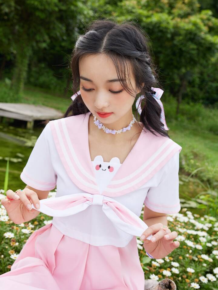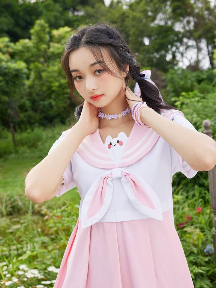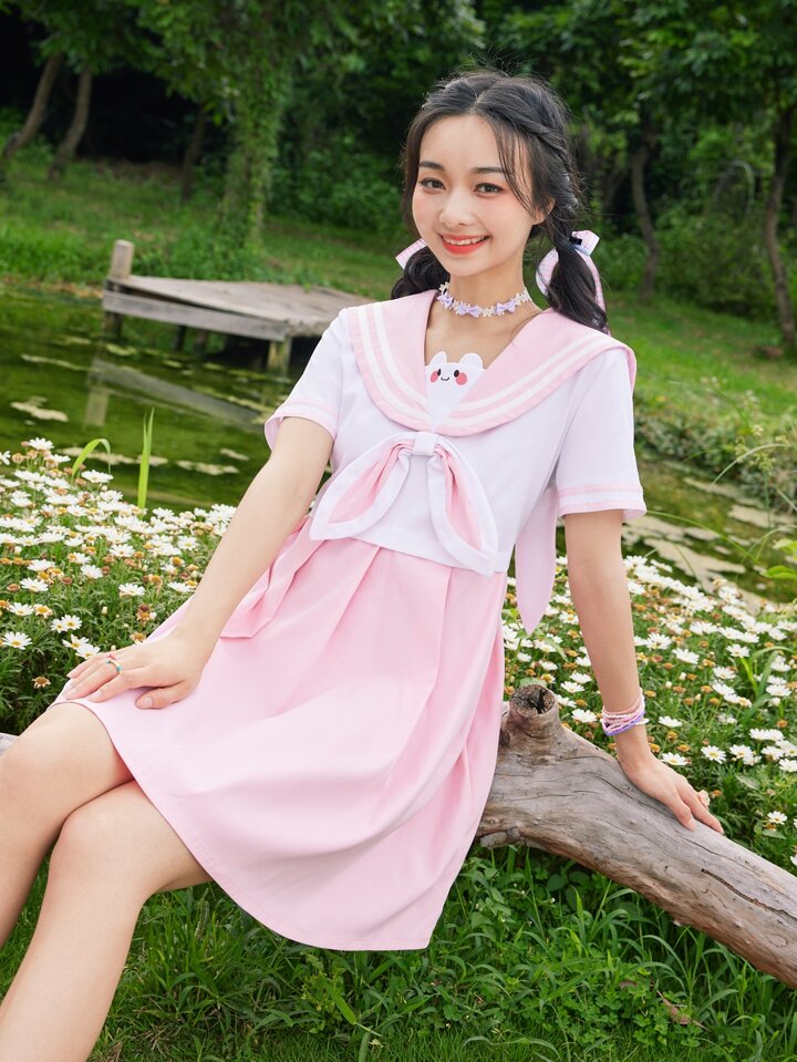 Kawaii Cartoon Embroidery Sailor Collar Fold Pleated Dress
