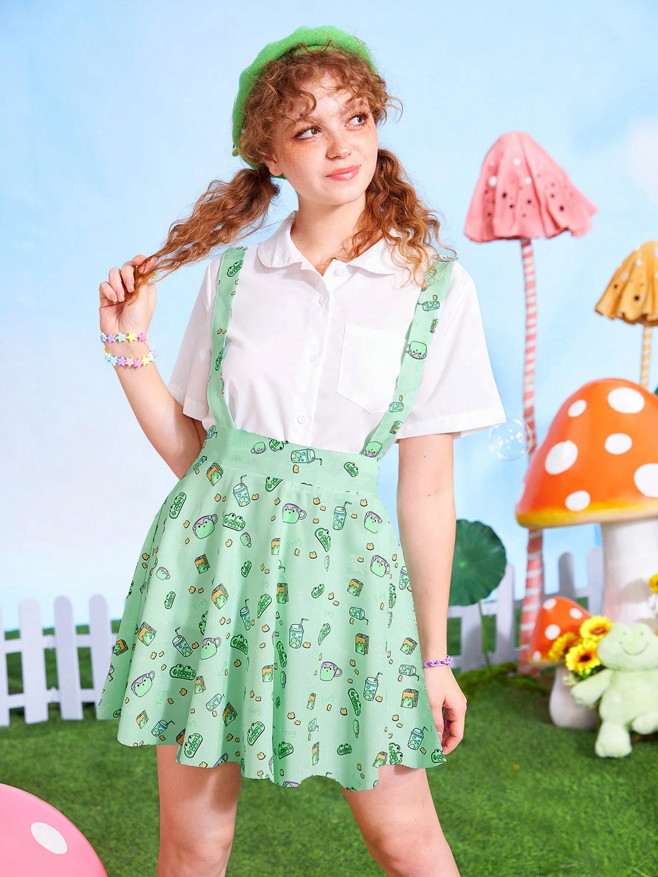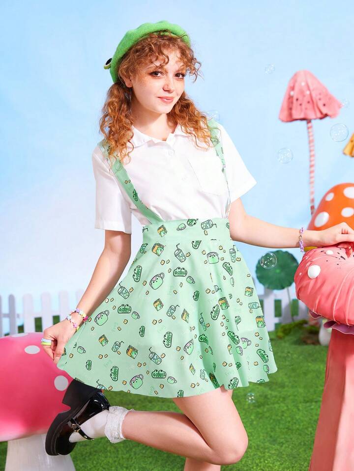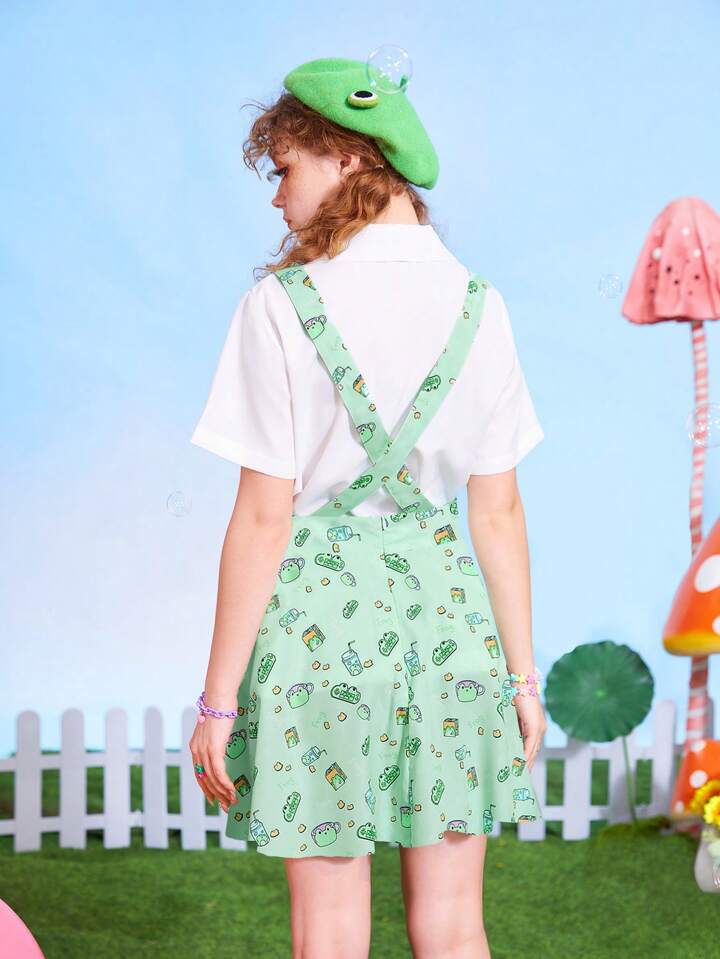 Kawaii Cartoon Frog Print Pinafore Skirt