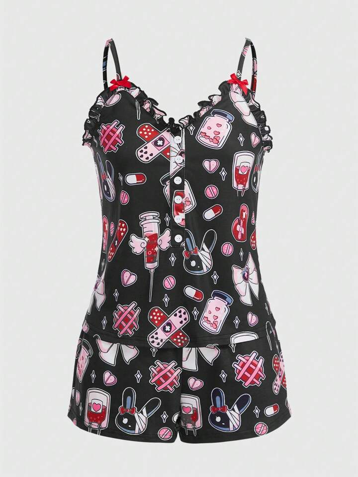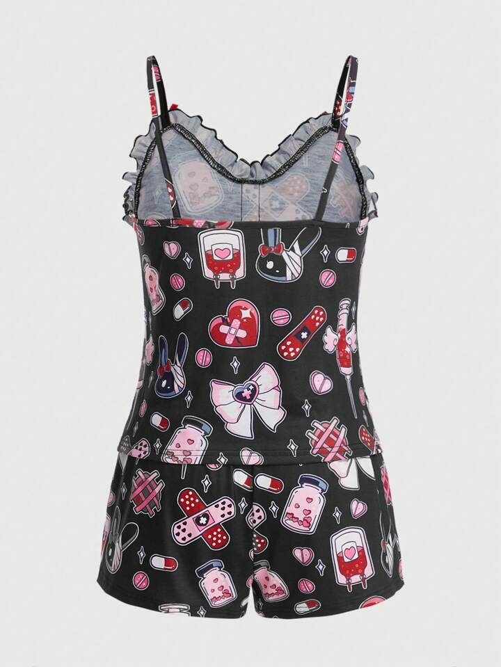 Kawaii Cartoon Graphic Frill Trim PJ Set