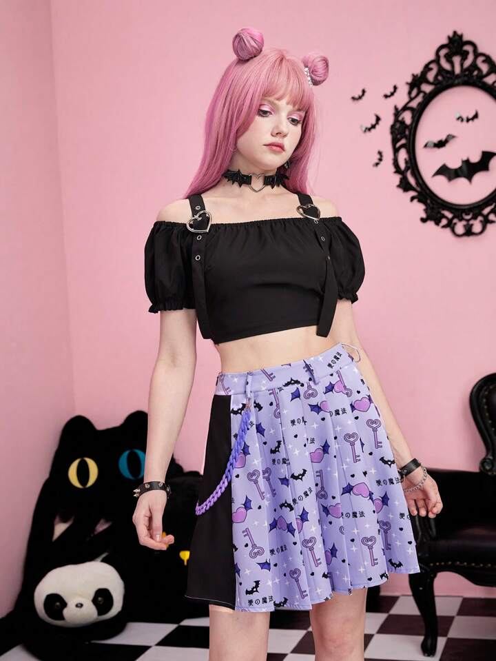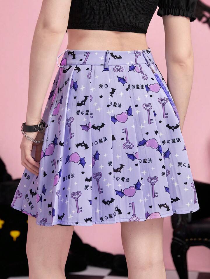 Kawaii Cartoon Graphic Pleated Skirt With Chain