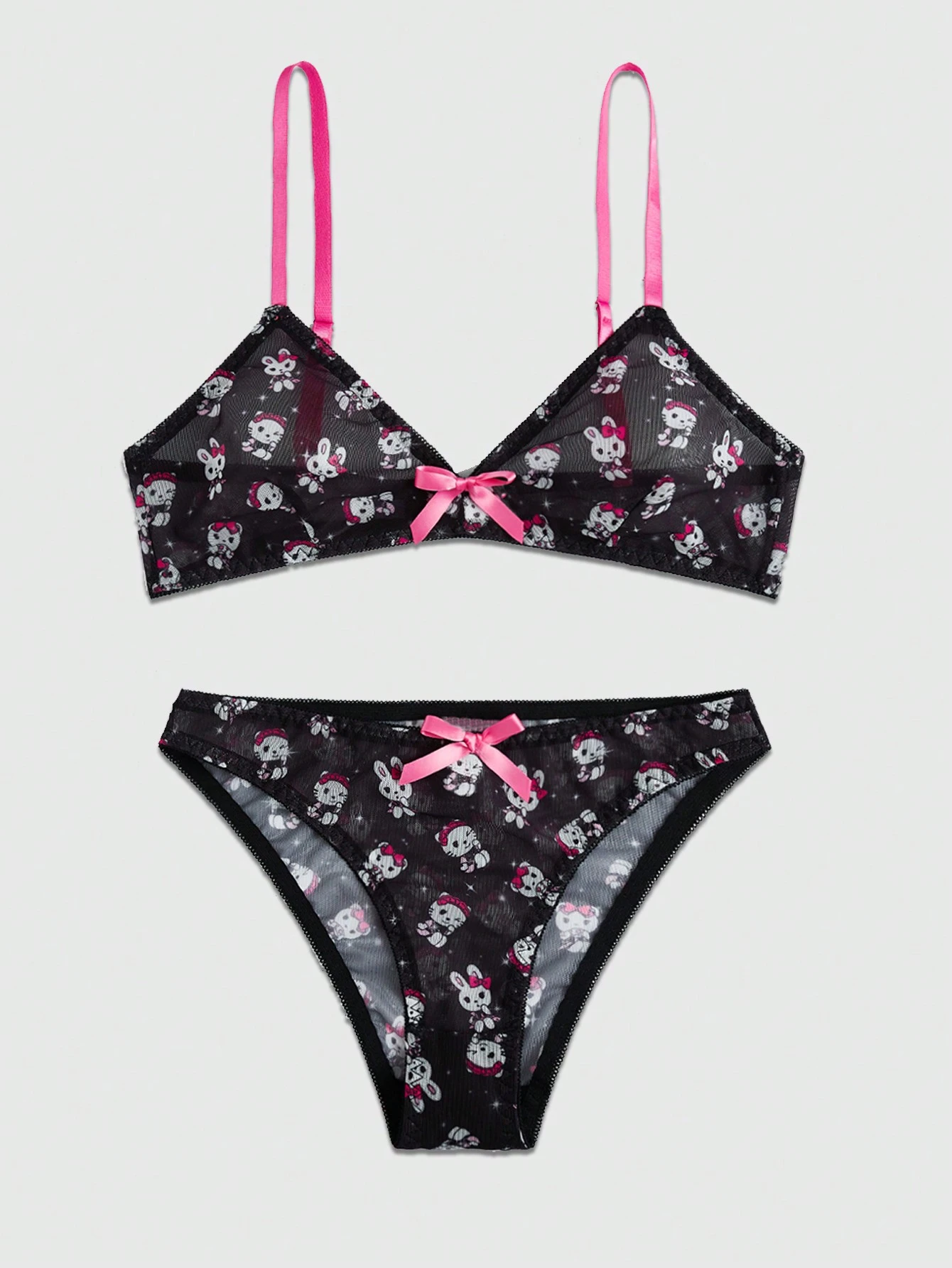 Kawaii Cartoon Print Mesh Bow Decor Lingerie Set