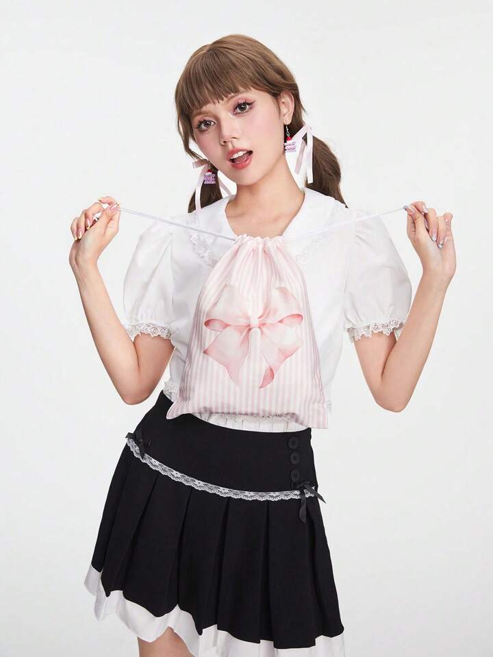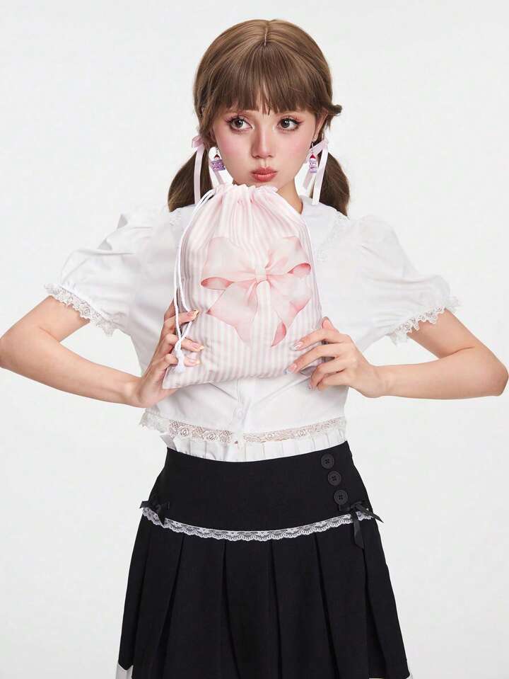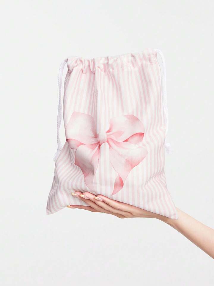 Kawaii Cartoon Striped Bow Drawstring Makeup Bag, Large Capacity Storage Pouch 401422