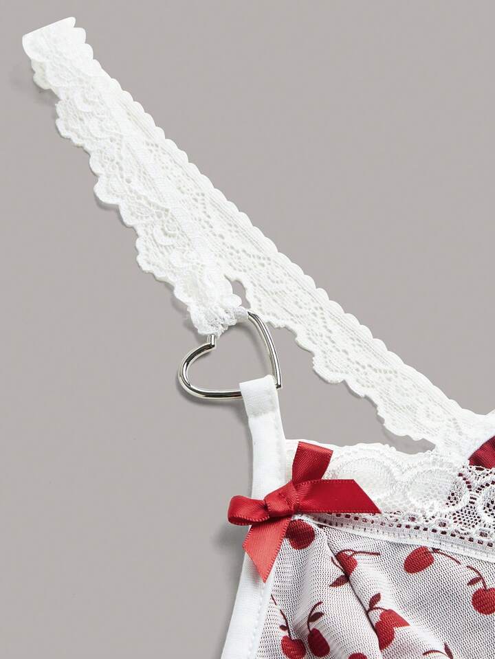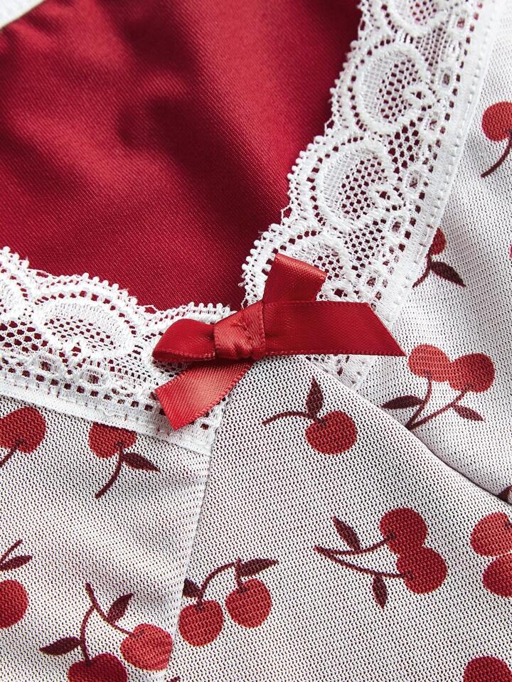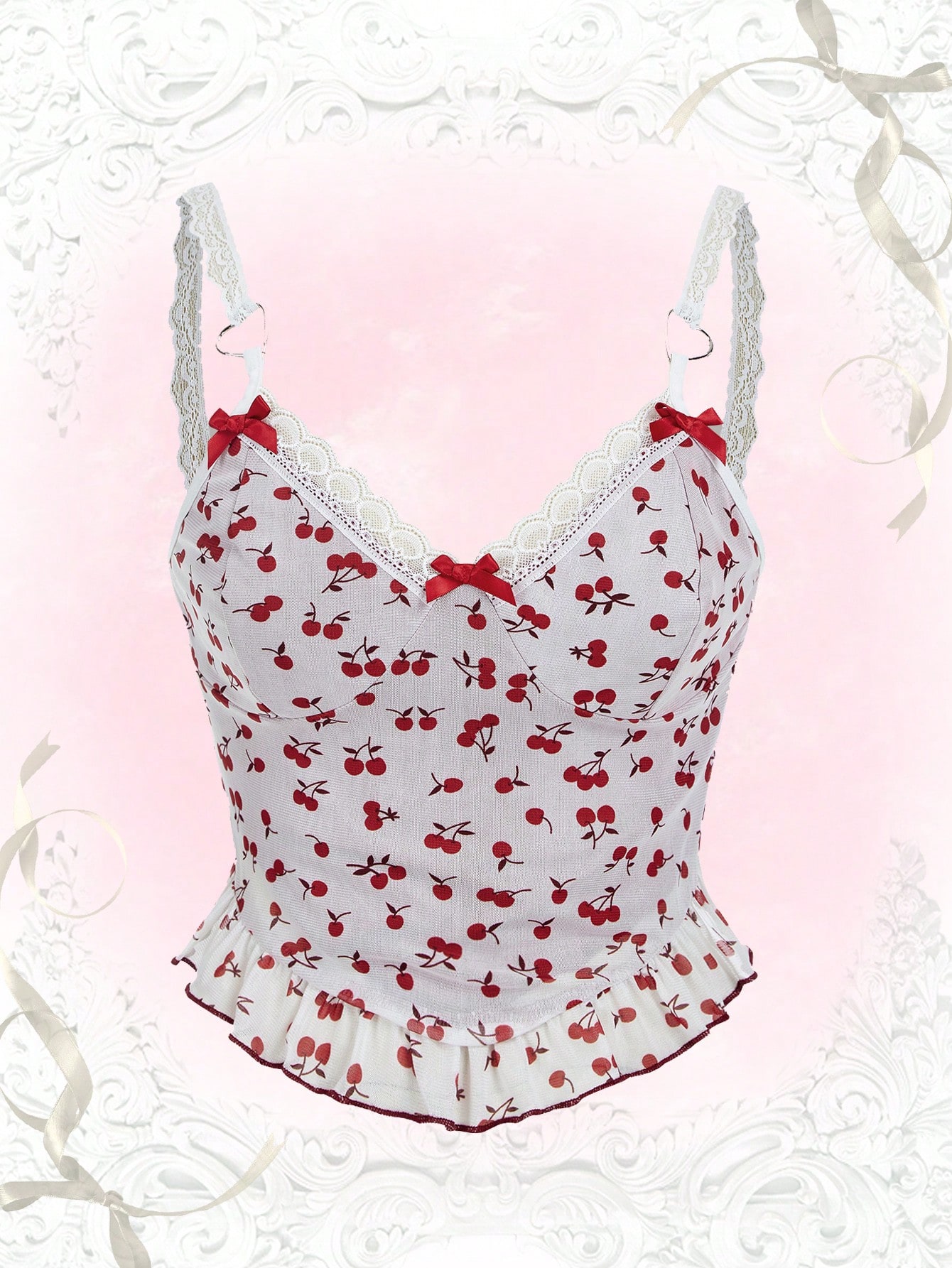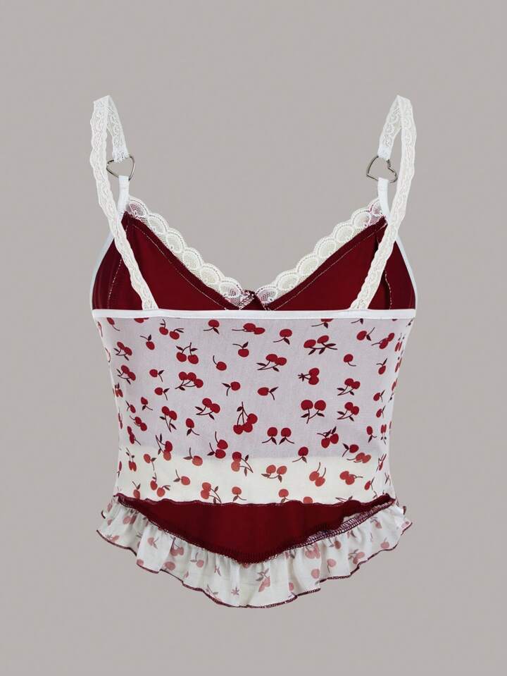 Kawaii Cherry Print Contrast Lace Ruffle Hem Cami Top