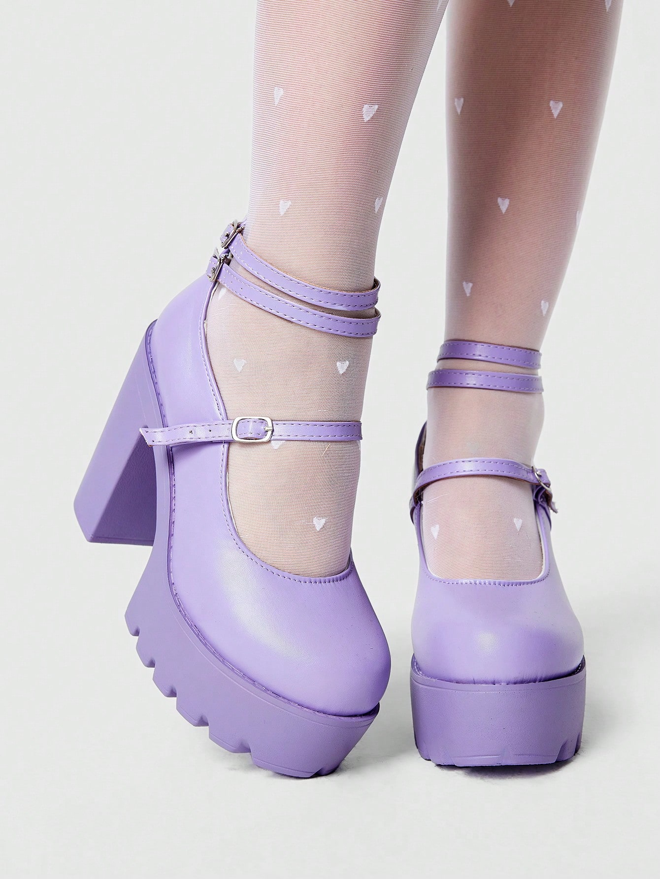 Kawaii Closed Toe Purple High Heels, Chunky Heel Mary Jane Shoes With Waterproof Platform, Multiple Buckle Accent Party Dress Pumps For Women Spring Shoes Spring Break Easter For Christmas