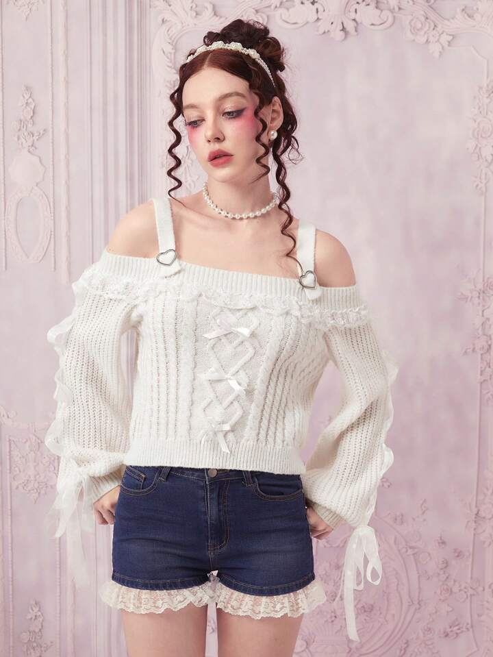 Kawaii Cold Shoulder Lace Trim Bow Decor Cable Knit Sweater, School,Long Sleeve Tops