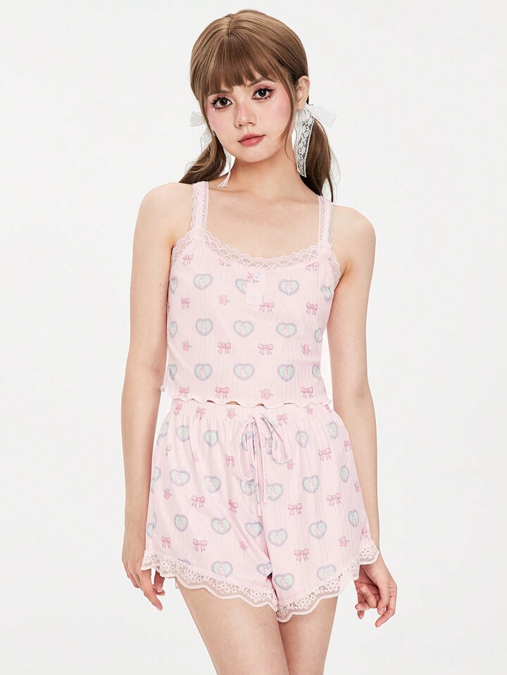 Kawaii Comfortable Girl-Ish Pajama Set With Bunny-Ribbed Pattern, Bowknot Design And Full Lace Trim For Women