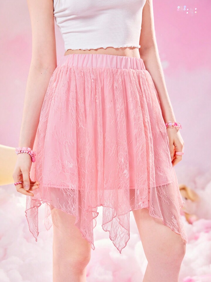 Kawaii Contrast Lace Asymmetrical Hem Skirt