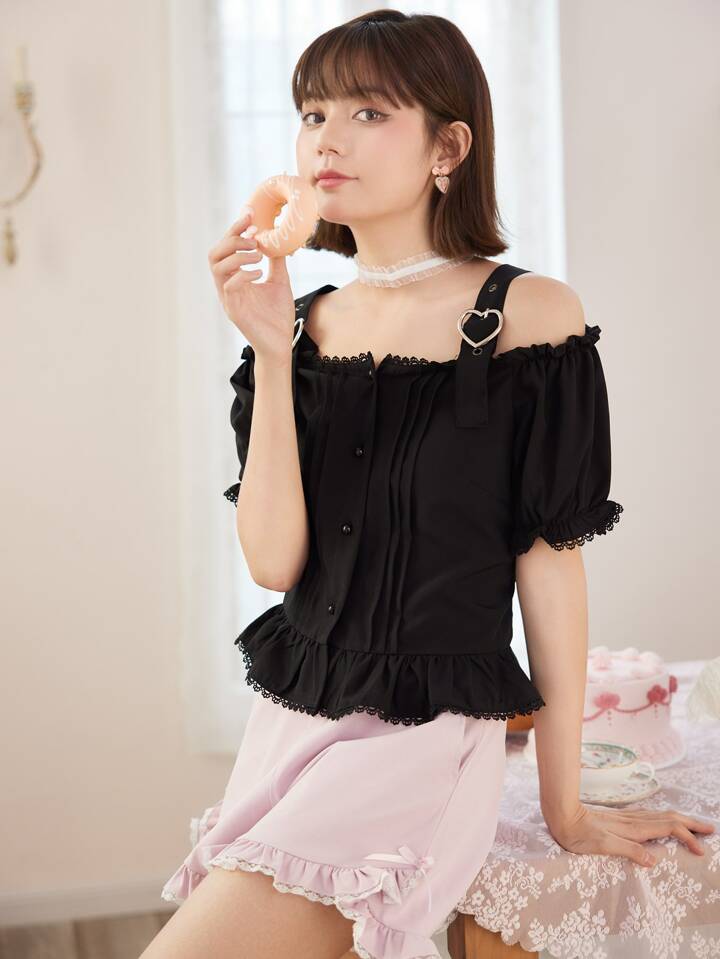 Kawaii Contrast Lace Puff Sleeve Ruffle Hem Blouse