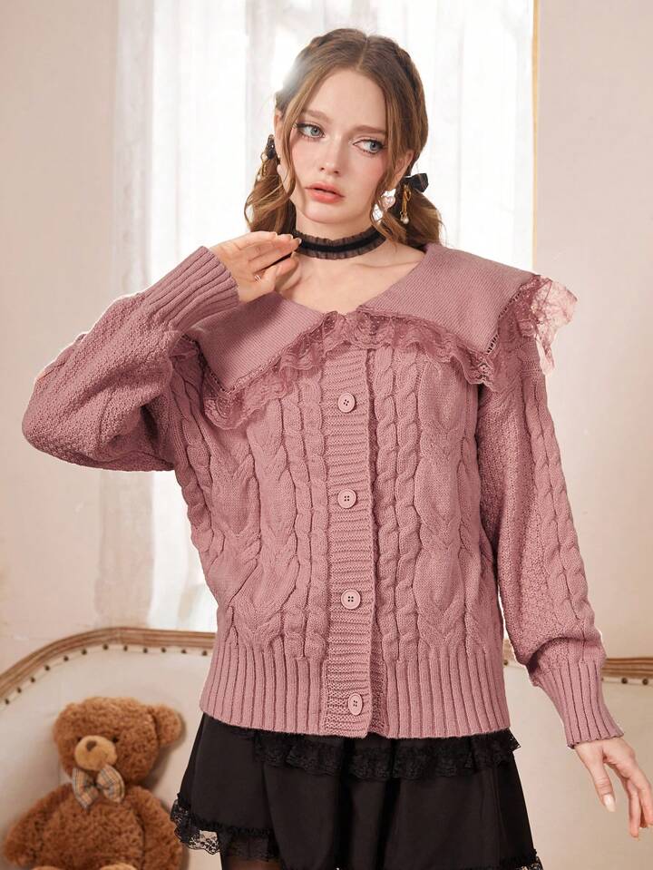 Kawaii Contrast Lace Statement Collar Cable Knit Cardigan