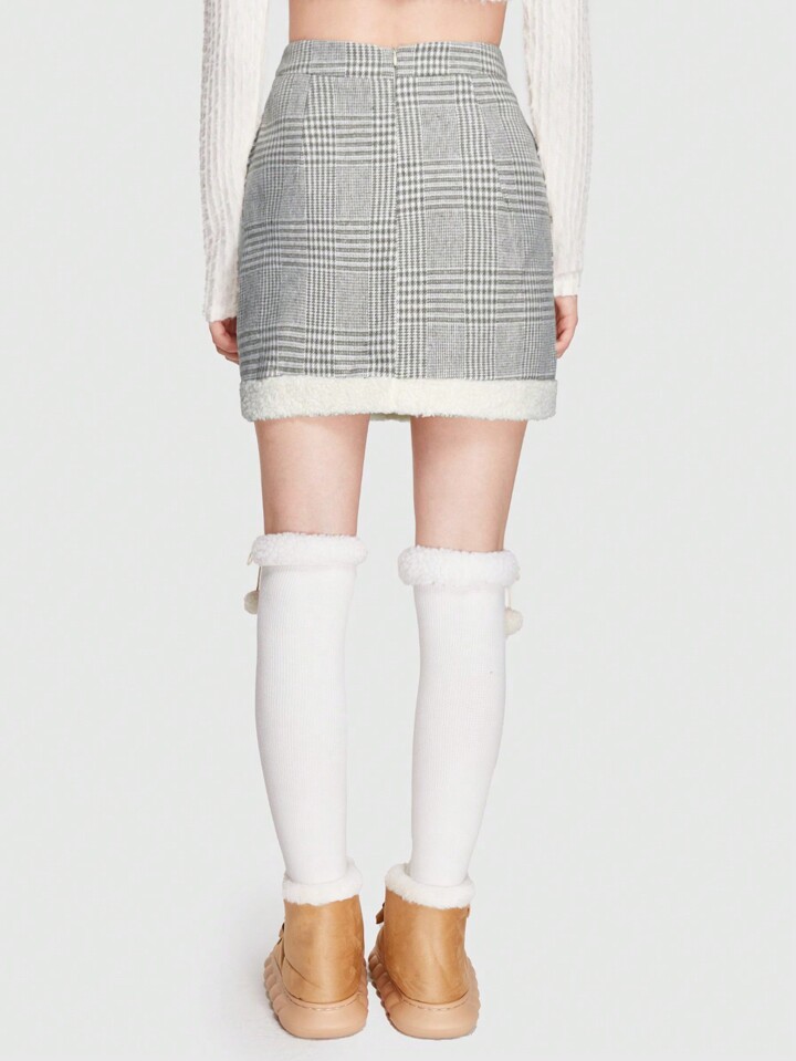 Kawaii Contrast Teddy Trim Flap Pocket Plaid Skirt