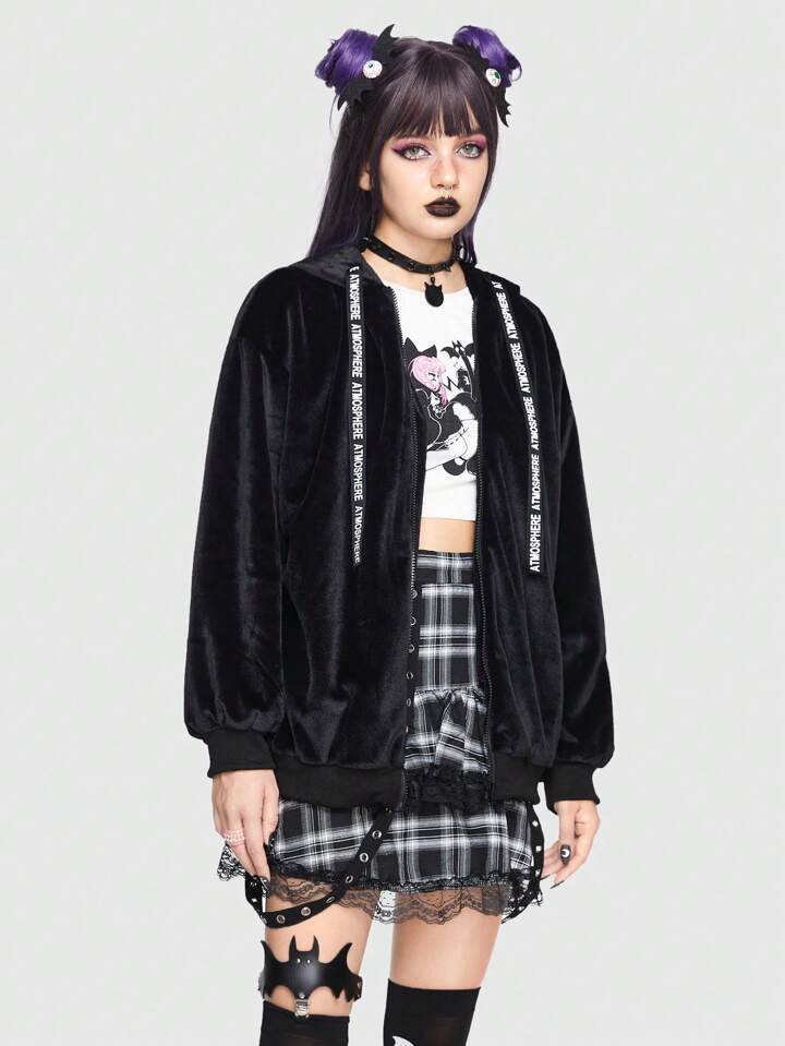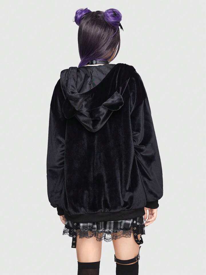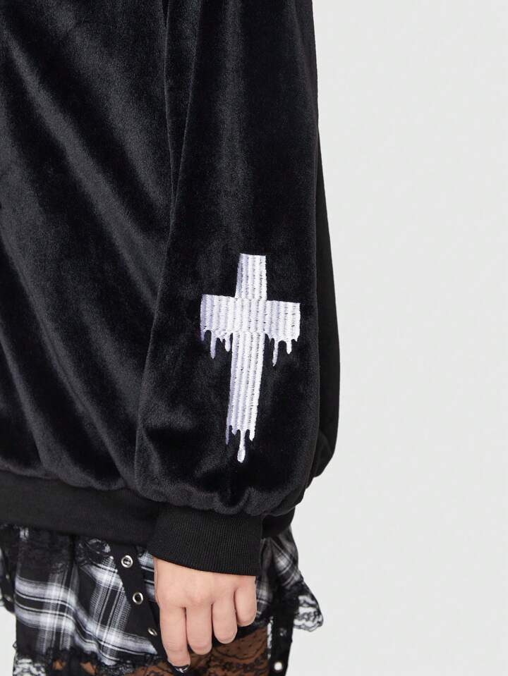 Kawaii Cross Embroidery Letter Graphic Drawstring Zip Up Velvet Hooded Jacket