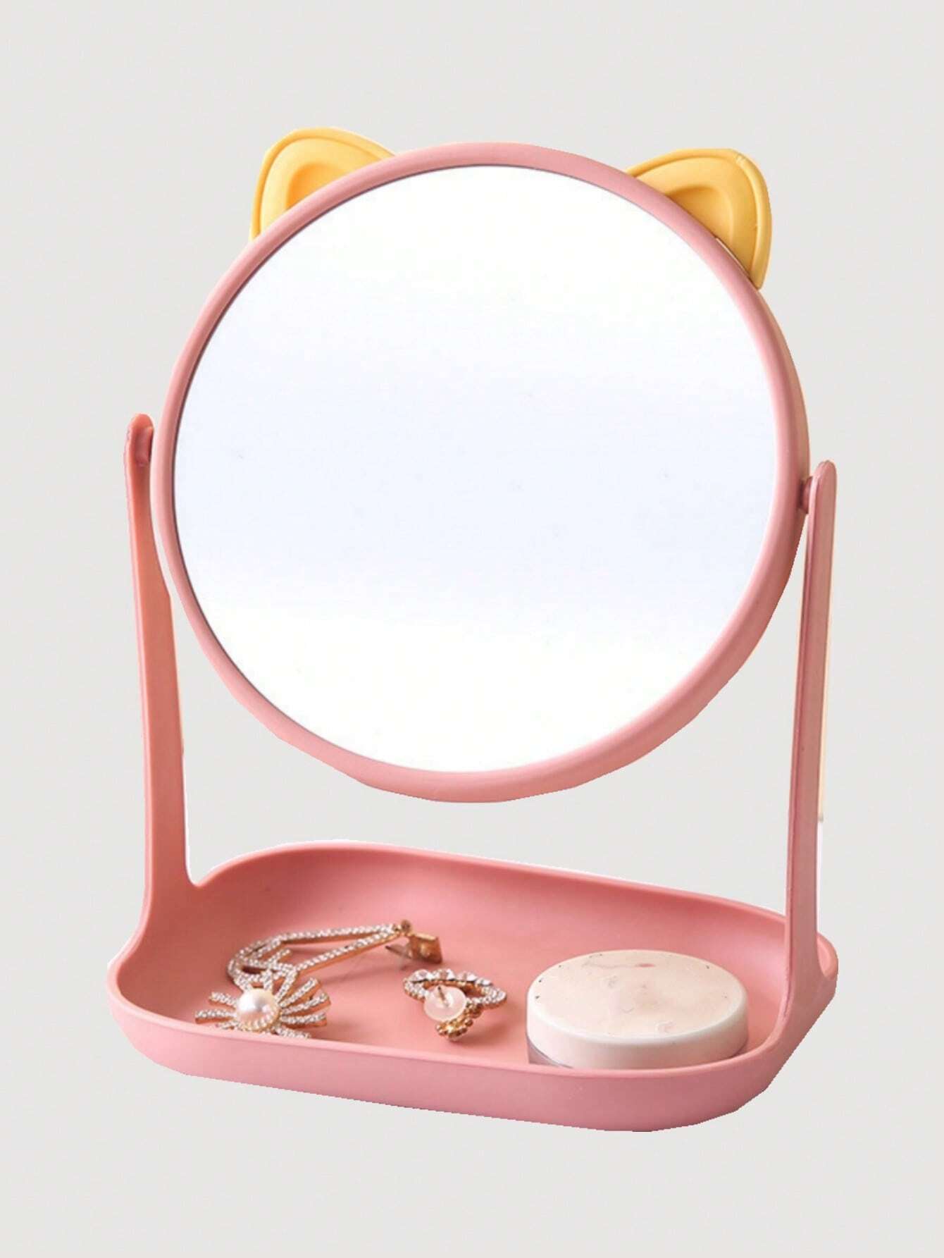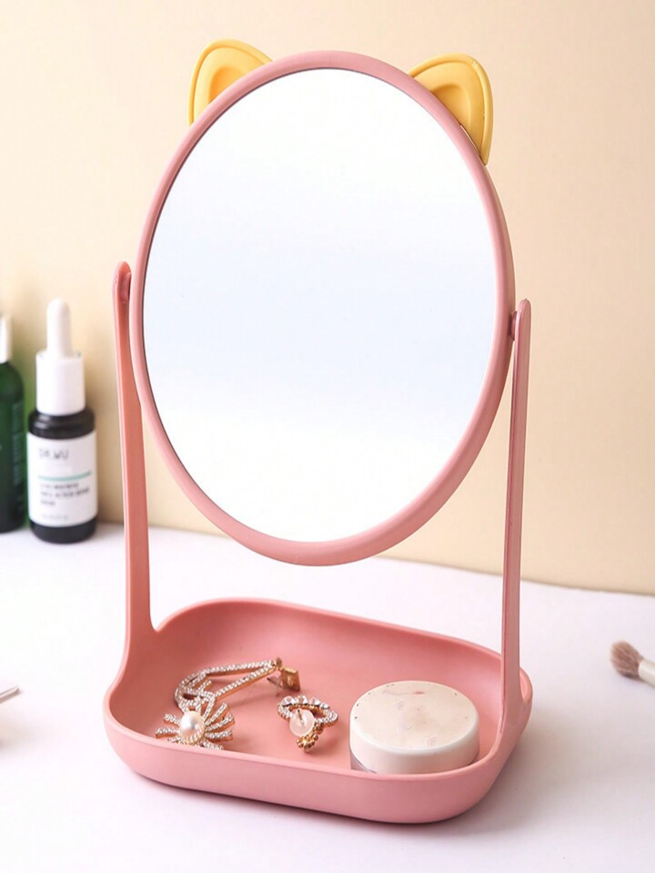 Kawaii Cute Cat Ear Design Desktop Vanity Mirror With Small Tray For Jewelry And Makeup
