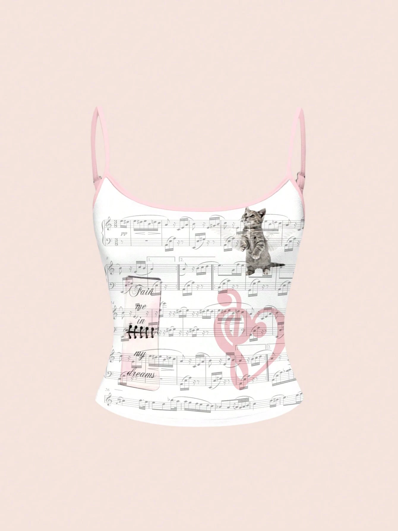 Kawaii Cute Cat Heart Music Note Piano Print Camisole Top, Girly & Elegant