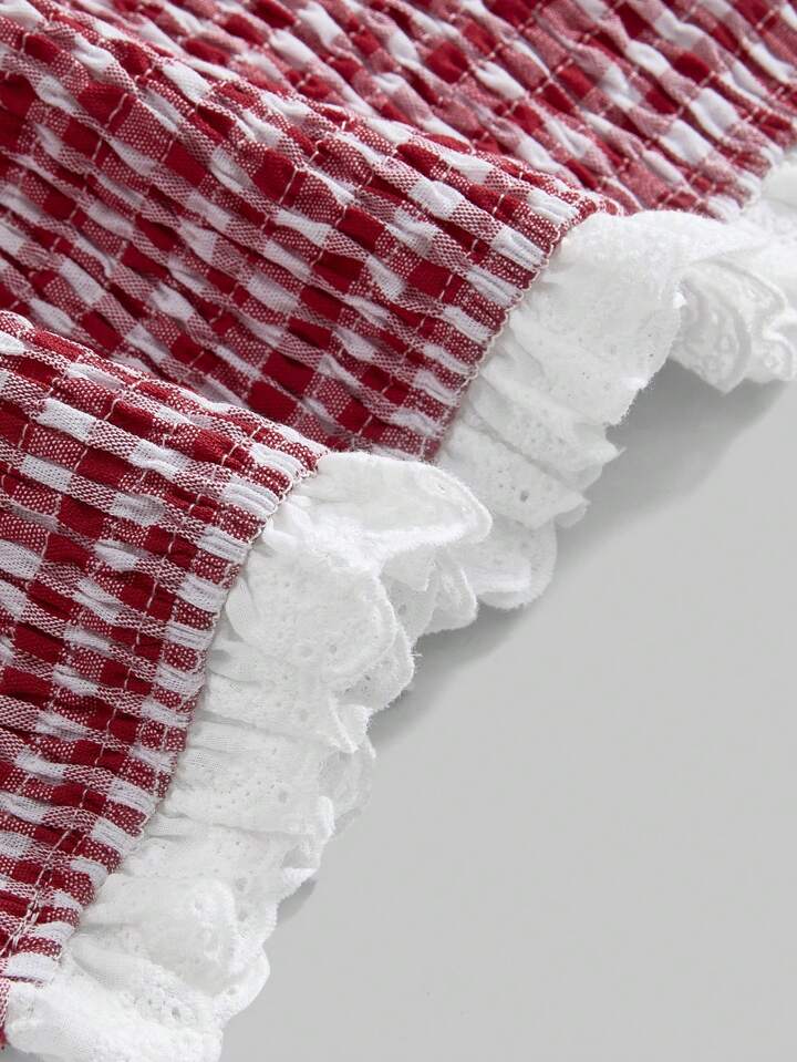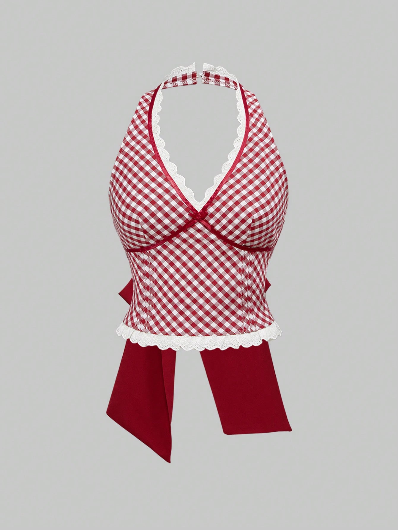 Kawaii Cute Gingham Patchwork Floral Lace & Bow Back Detail Slim Fit Halter Tank Top