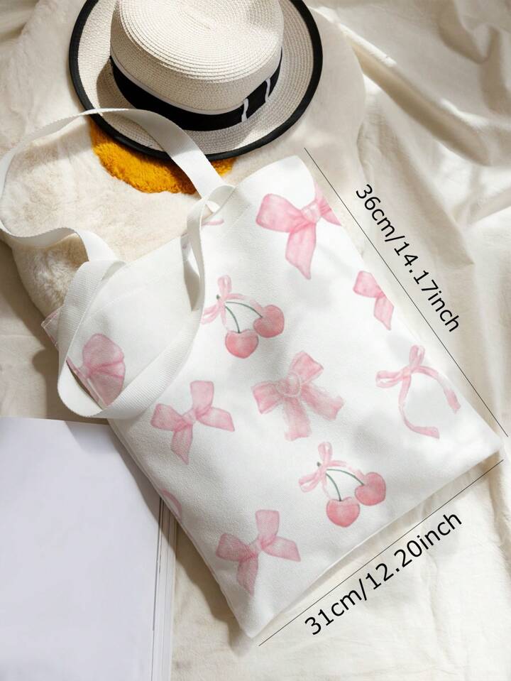 Kawaii Cute Pink Bow, Heart, Cherry Pattern Double-Sided Print Canvas Shoulder Bag